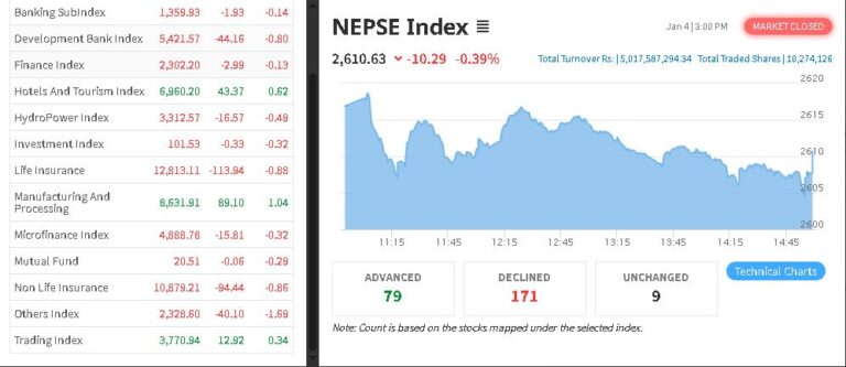 काठमाण्डु– साताको कारोबारको पहिलो दिन सेयर बजार ओरालो लागेको छ । आज नेप्से १० अंकले घटेर परिसुचक २६१० मा झरेको छ ।