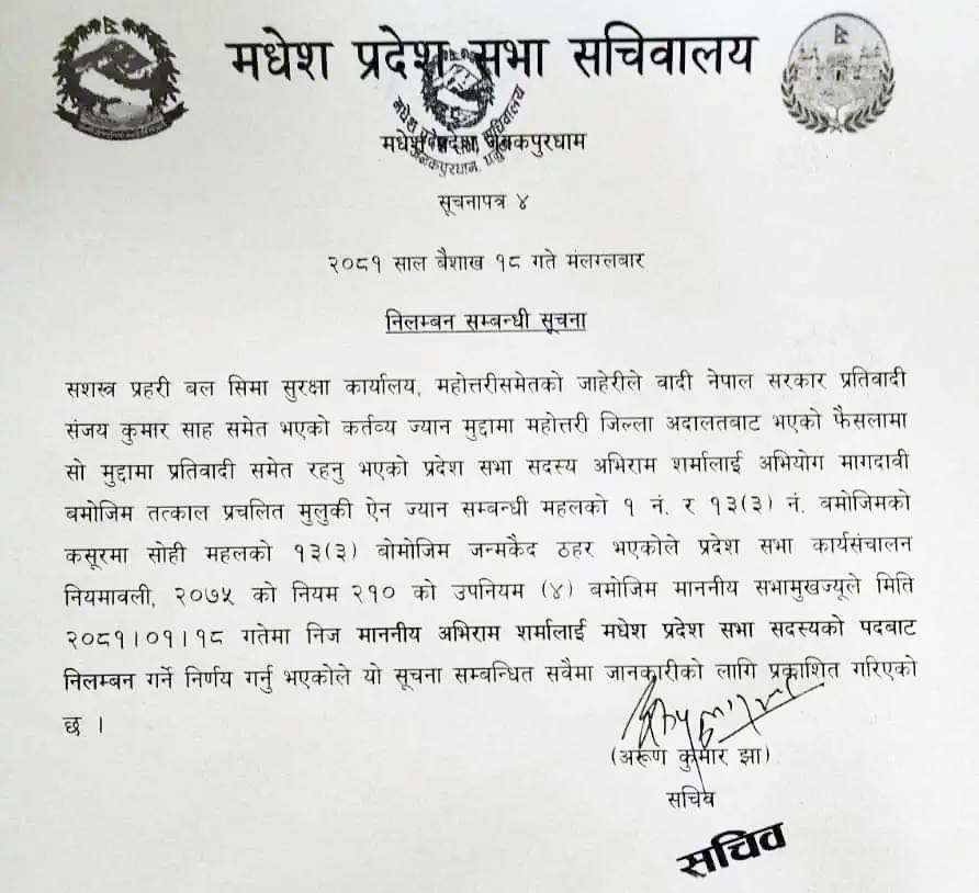 महोत्तरीमा २०७२ सालमा भएको मधेश आन्दोलनका बेला सशस्त्र प्रहरीका असई थमन विक हत्या प्रकरणमा महोत्तरी जिल्ला अदालतबाट जन्मकैदको सजाय पाएका लोसपाका मधेश प्रदेशसभा सदस्य तथा संसदीय दलका नेता अभिराम शर्मालाई निलम्बन गरिएको प्रदेशसभा सचिवालयले जानकारी दिएको छ ।