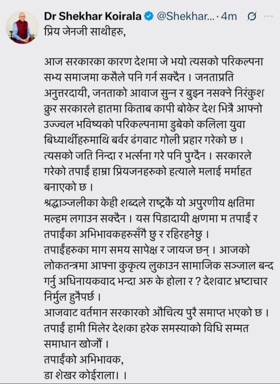 जेन–जी आन्दोलनमा सहभागी भई हातमा किताब–कापी बोकेर उज्ज्वल भविष्यको परिकल्पनामा डुबेका कलिला युवामाथि सरकारले बर्बर ढंगले गोली चलाएको भन्दै उनले गहिरो दु:ख व्यक्त गरेका छन् ।