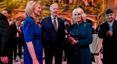 Foreign Secretary Liz Truss, US President Joe Biden and Camillla, Duchess of Cornwall, talk at a COP26 reception at the Kelvingrove Art Gallery