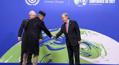 Prime Minister Boris Johnson and António Guterres, Secretary-General of the United Nations , greet Sher Bahadur Deuba, Prime Minister of Nepal, at COP26 World Leaders Summit