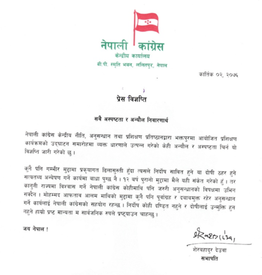 ‘१२ वर्ष पुरानो मुद्दामा मैले यही संकेत गरेको हुँ । तर, कानुनी राज्यमा विश्वास गर्ने नेपाली कांग्रेस कोहीमाथि पनि जरुरी अनुसन्धानको विपक्षमा उभिन सक्दैन’ देउवाले जारी विज्ञप्तिमा भनिएको छ, ‘मोहम्मद आफताव आलममाथिको मुद्दामा कुनै पनि पूर्वाग्रह र दवावमुक्त रहेर अनुसन्धान गर्ने कार्यलाई नेपाली कांग्रेसको सहयोग रहन्छ ।’