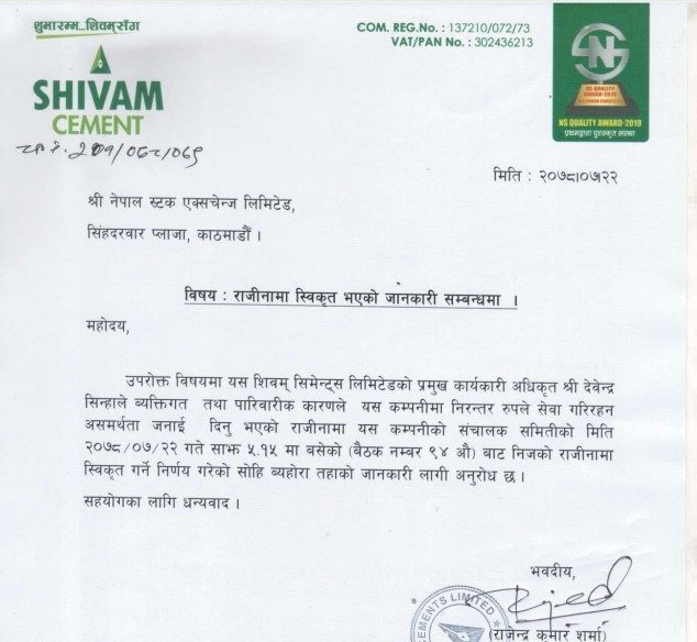 काठमाण्डु – शिवम् सिमेन्ट्स लिमिटेडको प्रमुख कार्यकारी अधिकृत देवेन्द्र सिन्हाले राजीनामा दिएका छन् । सीईओ सिंहाले पदबाट दिएको राजीनामा सोमबार साँझ बसेको कम्पनीको सञ्चालक समितिको बैठकले स्वीकृत गरेको छ ।