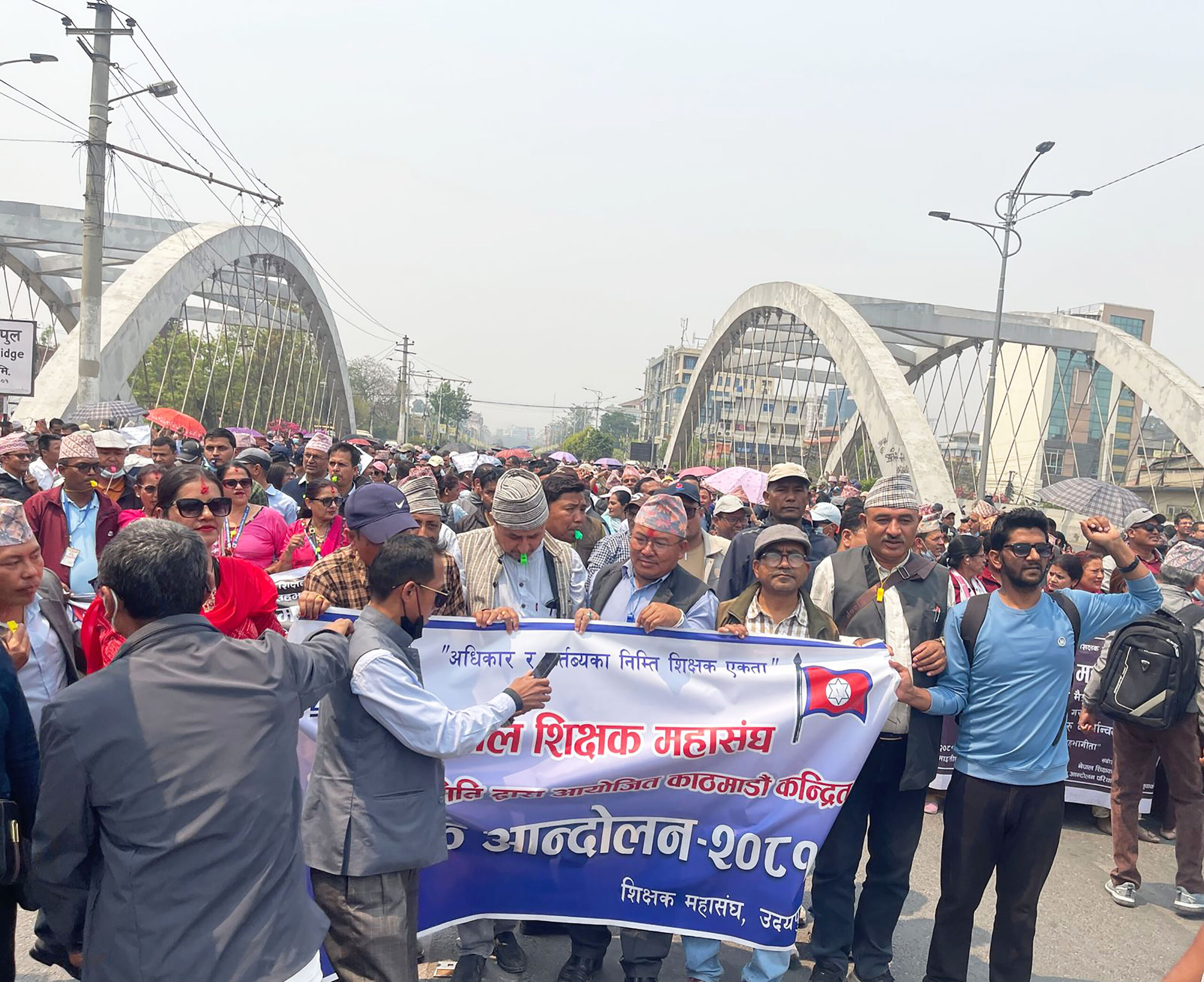 काठमाण्डु– नेपाल शिक्षक महासङ्घले विभिन्न माग राख्दै सुरु गरेको आन्दोलन आज पनि जारी छ । आज शिक्षकहरु बबरमहल–बानेश्वर सडकमा भेला भएर सिठ्ठी बजाउँदै शान्तिपूर्ण तरिकाले सरकारको ध्यानाकर्षण गराइरहेका छन् ।