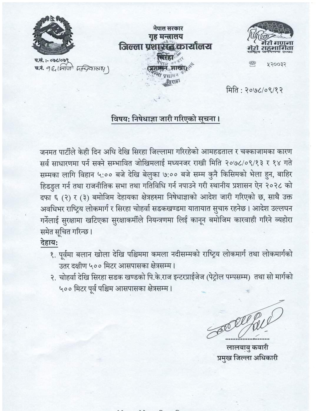 सिरहामा दुई दिनसम्मका लागि निषेधाज्ञा जारी, पाँच जनाभन्दा बढी भेला हुन राेक