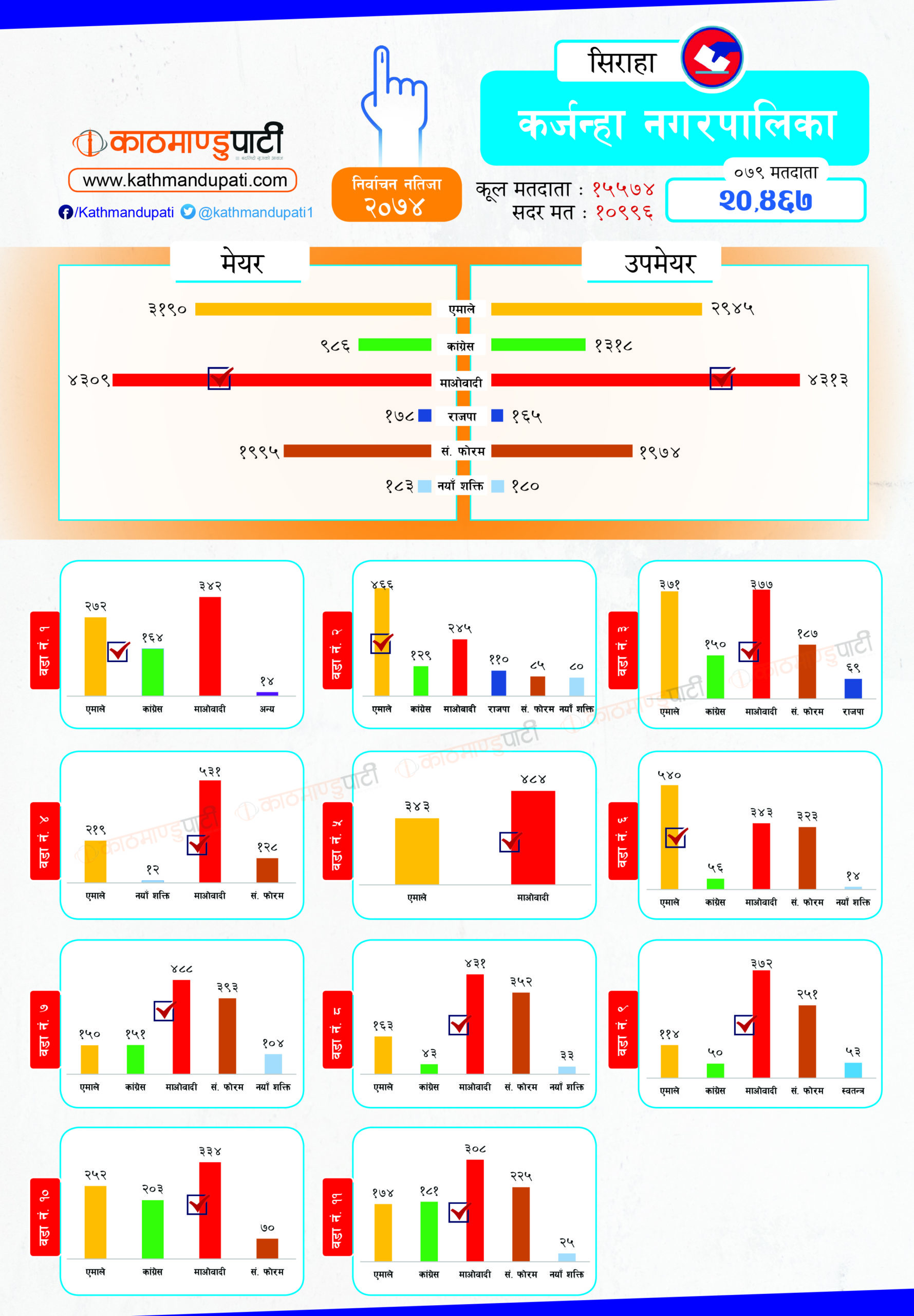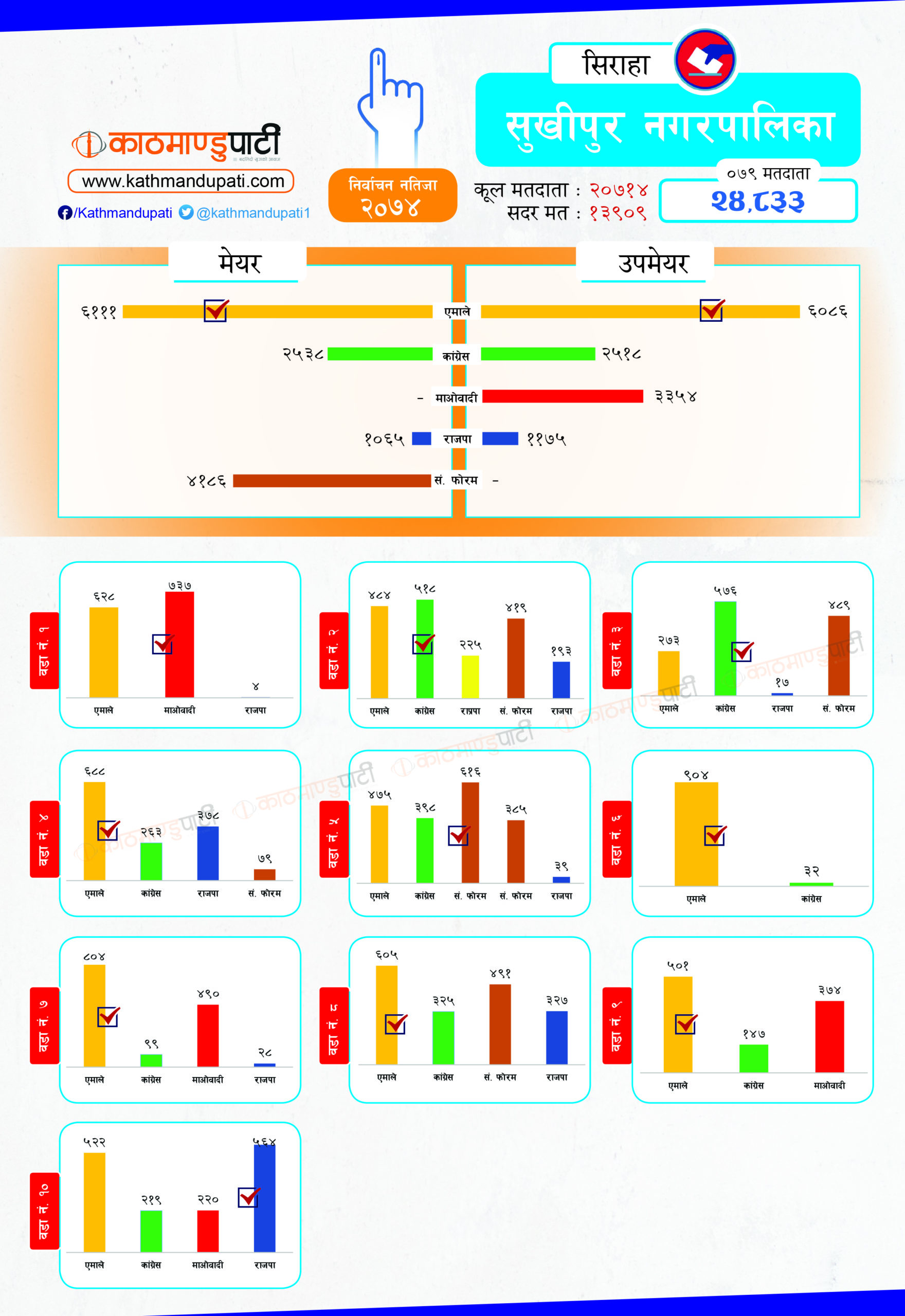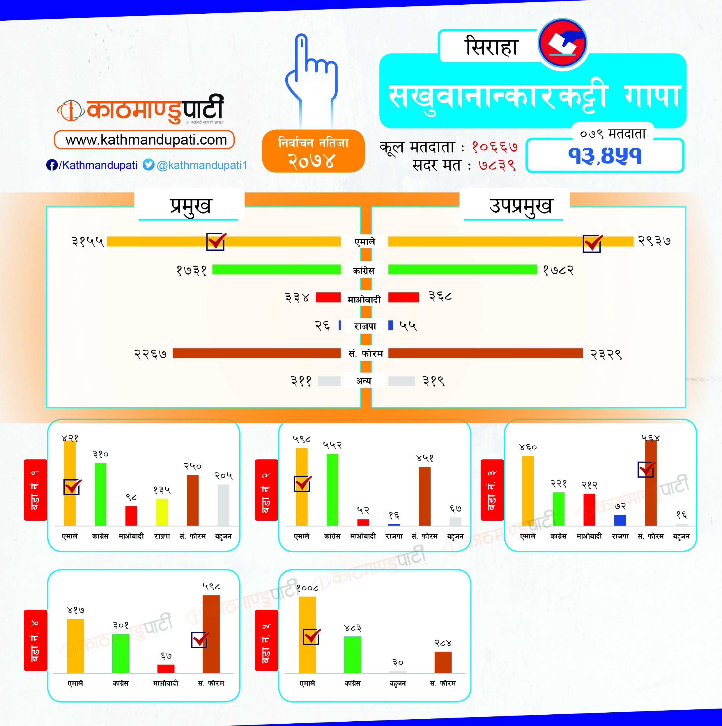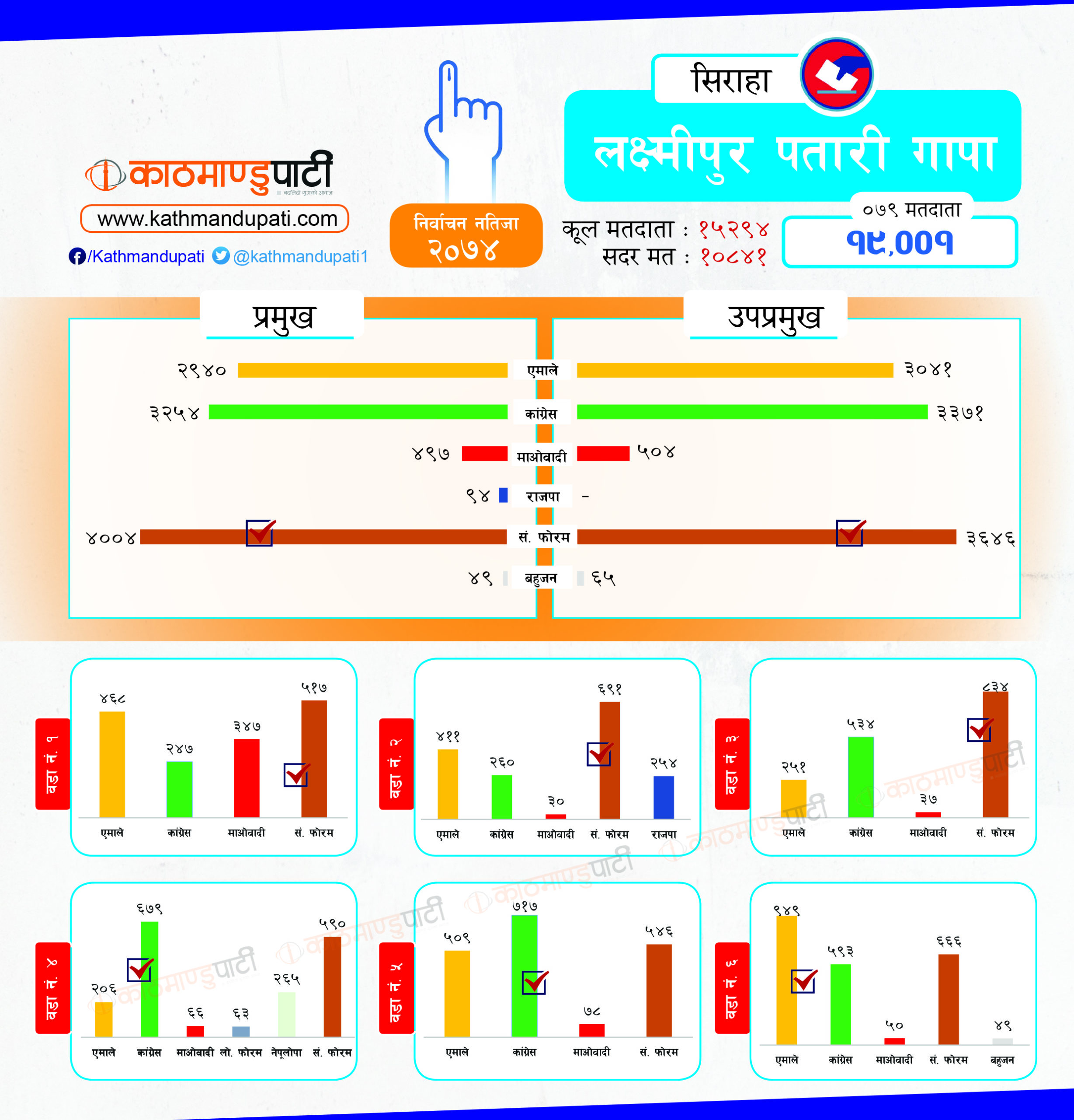संघीय फोरमले बरियारपट्टी, भगवानपुर, लक्ष्मीपुर–पतारी र विष्णुपुर गाउँपालिकाको अध्यक्ष–उपाध्यक्ष तथा सदरमुकामसमेत रहेको सिराहा नगरपालिकाको मेयरका साथै औरही गाउँपालिकाको उपाध्यक्ष जितेको थियो । एमालेले लहान र सुखीपुर नगरपालिकाको मेयर–उपमेयर, सिराहा नगरपालिकाको उपमेयर तथा सखुवानान्कारकट्टी र नरहा गाउँपालिकाको अध्यक्ष–उपाध्यक्ष जितेको थियो ।