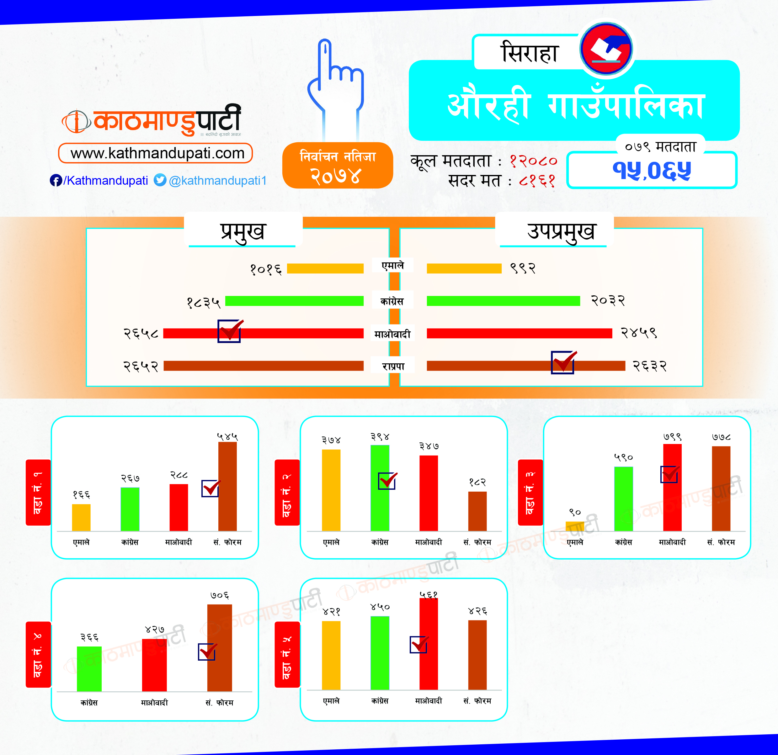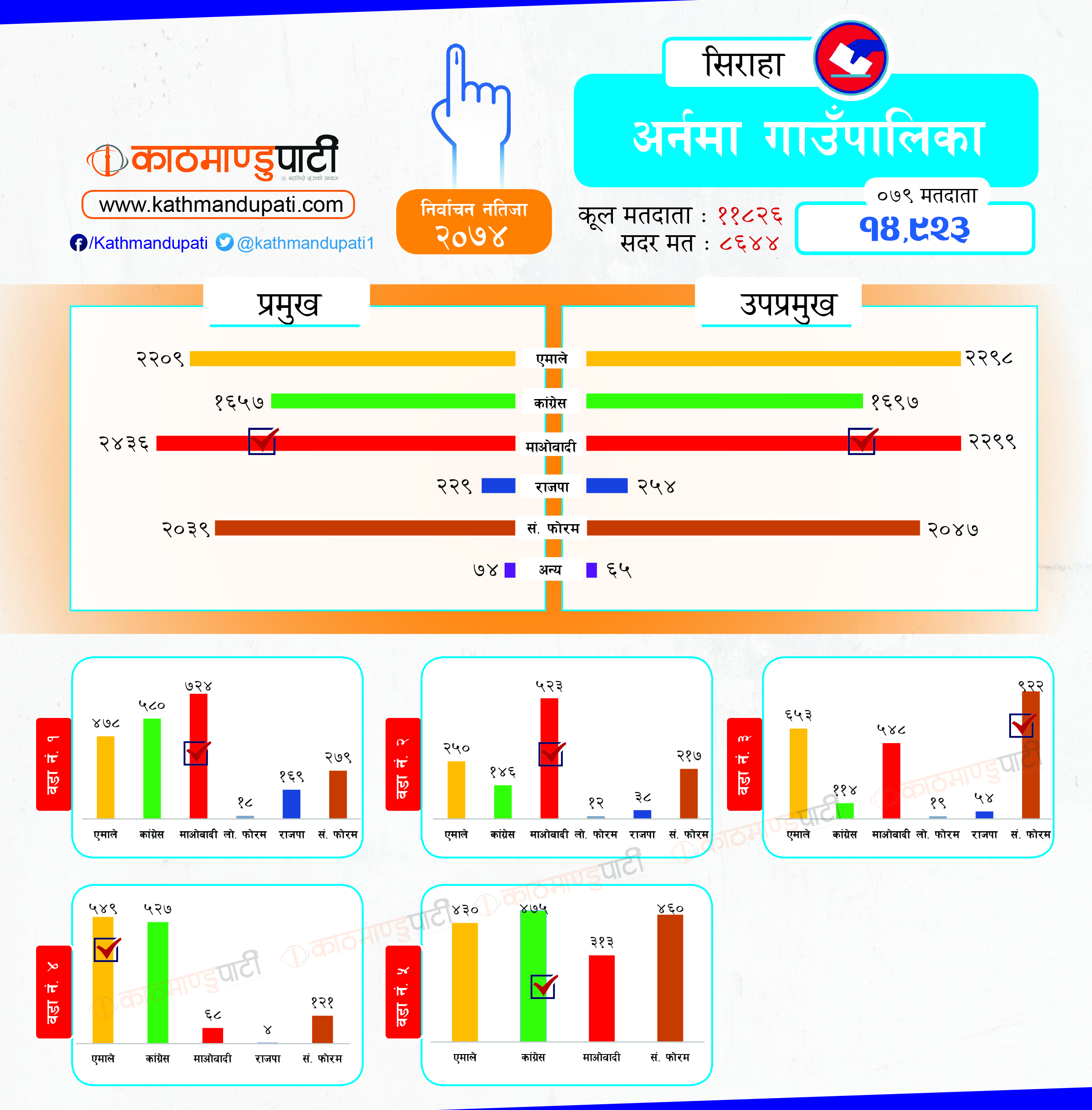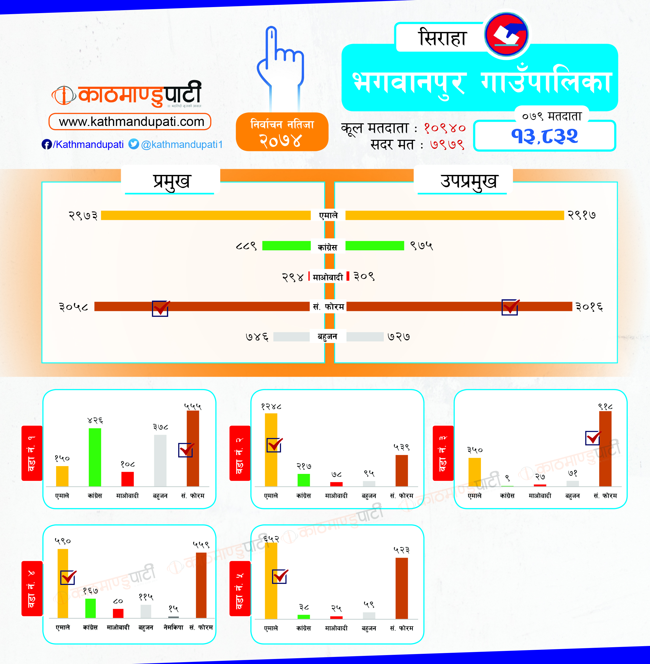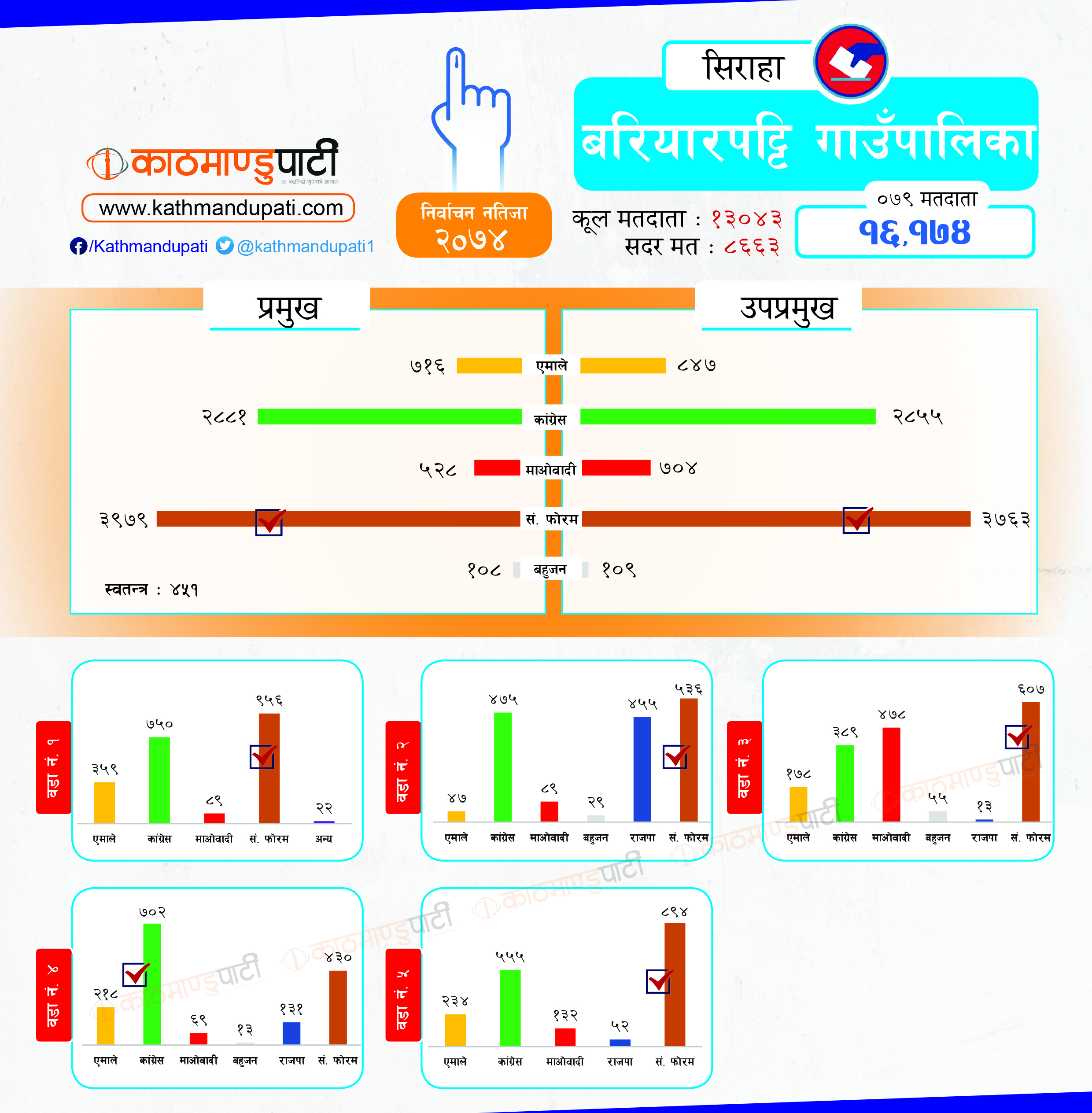 संघीय फोरमले बरियारपट्टी, भगवानपुर, लक्ष्मीपुर–पतारी र विष्णुपुर गाउँपालिकाको अध्यक्ष–उपाध्यक्ष तथा सदरमुकामसमेत रहेको सिराहा नगरपालिकाको मेयरका साथै औरही गाउँपालिकाको उपाध्यक्ष जितेको थियो । एमालेले लहान र सुखीपुर नगरपालिकाको मेयर–उपमेयर, सिराहा नगरपालिकाको उपमेयर तथा सखुवानान्कारकट्टी र नरहा गाउँपालिकाको अध्यक्ष–उपाध्यक्ष जितेको थियो ।