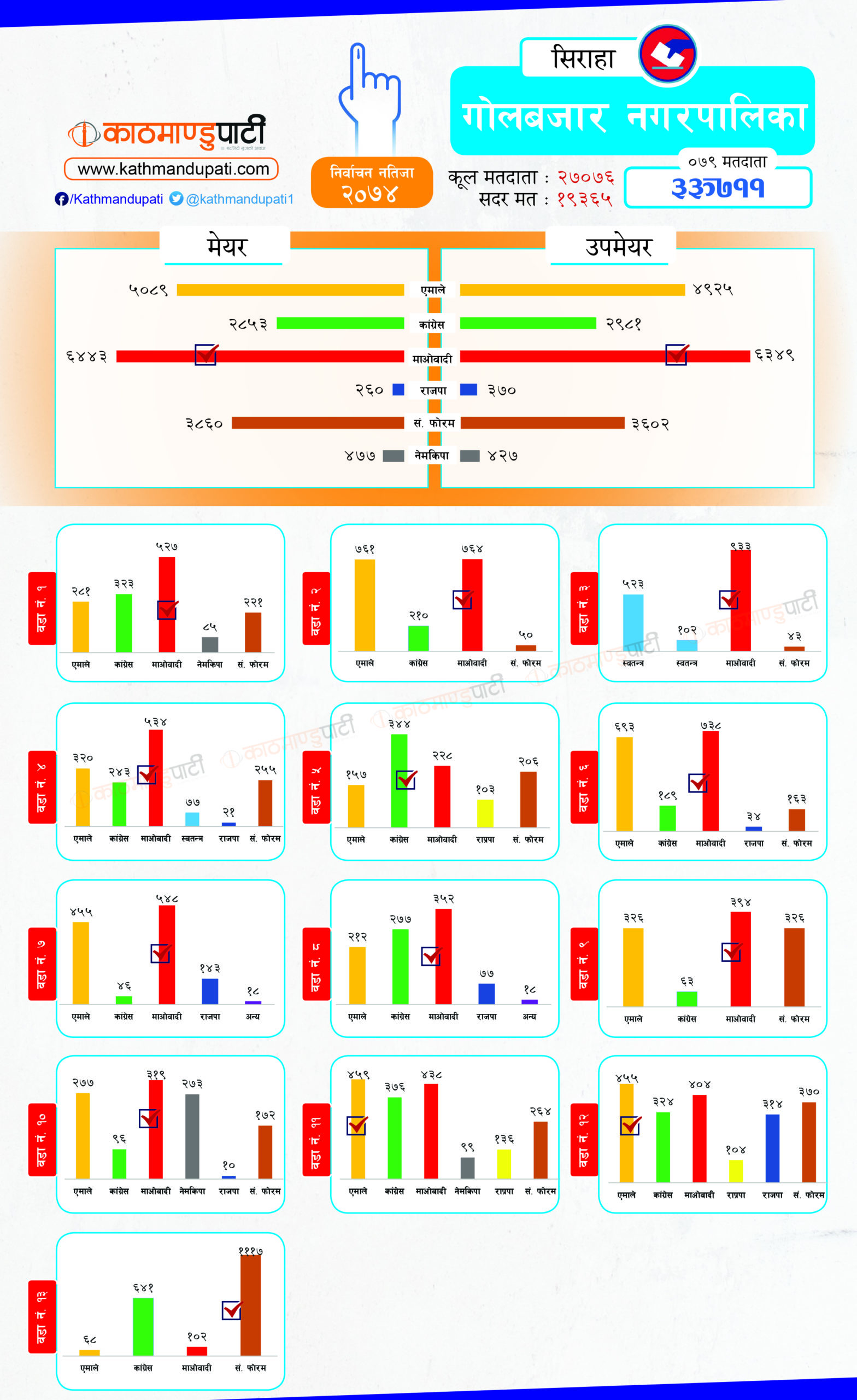 अन्य कतिपय पालिकामा गठबन्धन बनेको छ भने कतिपयमा दलहरू छुट्टाछुट्टै उत्रिएका छन् । माओवादीले जितेका धेरै पालिकामा एमाले र कांग्रेससँग प्रतिस्पर्धा देखिन्छ । जनता समाजवादी पार्टीको मुख्य प्रतिस्पर्धी कांग्रेस हो । औरहीमा माओवादी र जसपाबीच प्रतिस्पर्धा छ । नरहामा एमाले र जसपा तथा नवराजपुरमा कांग्रेस, एमाले र जसपाबीच त्रिपक्षीय भिडन्त देखिन्छ ।