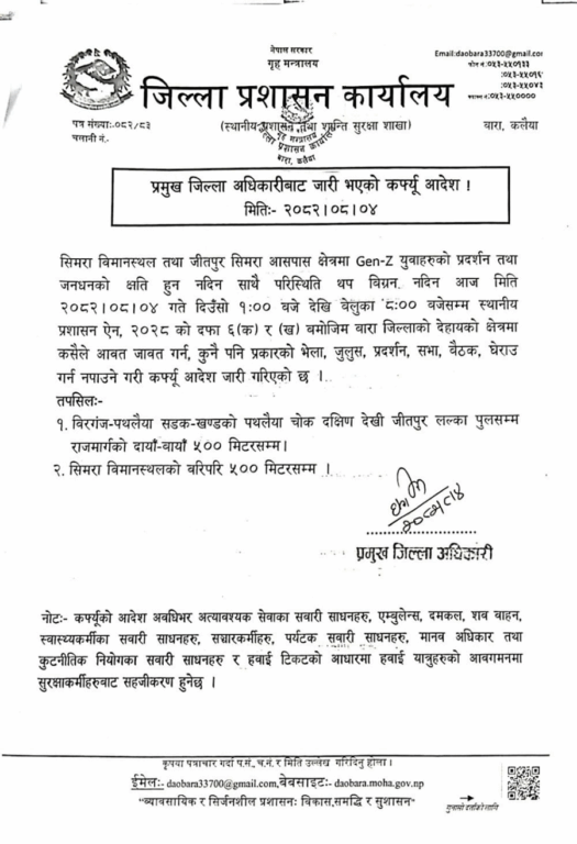 जिल्ला प्रशासन कार्यालय बाराले सिमरामा बिहीबार पनि कर्फ्यु लगाएको छ। प्रदर्शनकारी जेनजी युवा र प्रहरीबीच झडप भएपछि प्रशासनले कर्फ्यु जारी गरेको हो। स्थिति भड्किन नदिने स्थानीय प्रशासनले दिउँसो १ बजेदेखि राति ८ बजेसम्मका लागि कर्फ्यू लगाएको हो ।