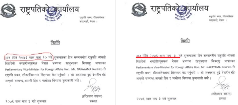 जापानका विदेश मामिलासम्बन्धी संसदीय उपमन्त्रीले राष्ट्रपति विद्यादेवी भण्डारीसँग शिष्टाचार भेट गरेको विषयबारे जारी गरिएको विज्ञप्तिमा माघ १० गतेको मिति लेखिएपछि आलोचना भएको हो ।