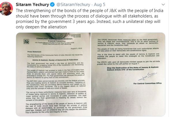 भाकपाले गैरकानुनी रुपमा उनलाई हिरासतमा राखेको भन्दै विरोध गरेको छ । बिहिबार याचुरी र राजाले कश्मीरका गभर्नर सत्यपाल मलिकलाई छुट्टाछुट्टै पत्र लेखेर आफ्नो भ्रमणको योजनाबारे जानकारी गराएका थिए । पत्रमा उनीहरुले आफ्नो भ्रमणका बेला कुनै पनि बाधा नआओस भन्ने चाहना व्यक्त गरेका थिए ।