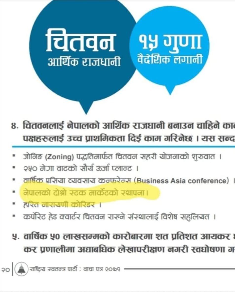 तर, रास्वपाले गत मंसिरमा सम्पन्न प्रतिनिधिसभाको निर्वाचनको क्रममा सार्वजनिक गरेको बाचा पत्रमा भने ‘नेपालको दोस्रो स्टक मार्केटको स्थापना’ भनेर बाचा पत्रको पेज नं. २० मा लेखेको छ । सांसद गौतमले भने नयाँ स्टक एक्सचेन्ज अविलम्ब रोकिनुपर्छ भन्दै पार्टीको बाचापत्र विपरित प्रतिनिधिसभा बैठकमा बोलेकी छन् । उनले भनिन्, ‘२० महिना अगाडी नेपालको पुँजी बजार लगभग ३२ सयको विन्दुमा पुगेको थियो । आज १८ सयको विन्दुमा झरेको छ । यसबिच लगानीकर्ताले लाखौँ रकम गुमाएका छन् ।’