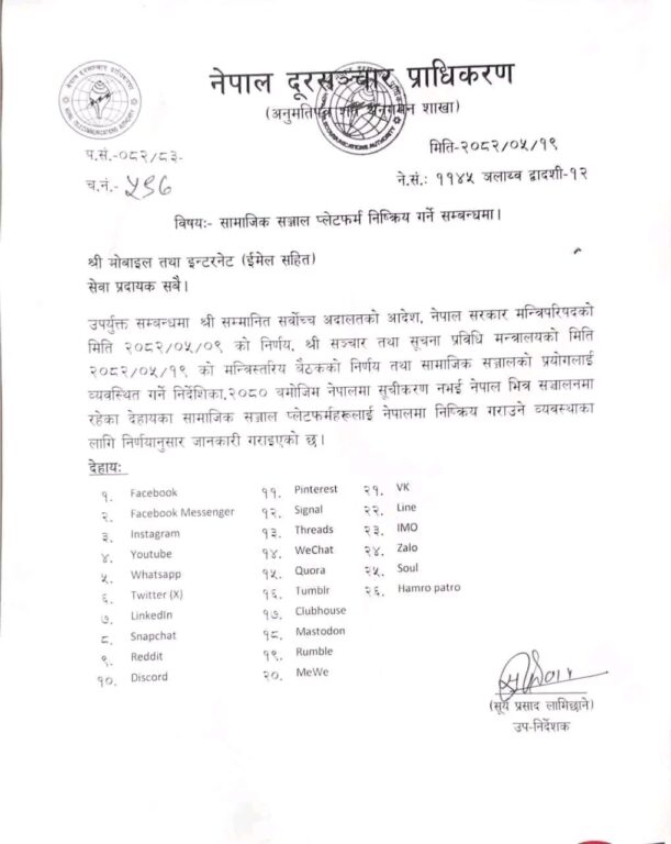 काठमाण्डु – नेपाल दूरसञ्चार प्राधिकरणले देशभित्र प्रयोगमा रहेका तर सूचीकृत नभएका विभिन्न सामाजिक सञ्जाल प्लेटफर्महरूलाई निष्क्रिय गर्न मोबाइल तथा इन्टरनेट सेवा प्रदायक कम्पनीहरूलाई निर्देशन दिएको छ ।