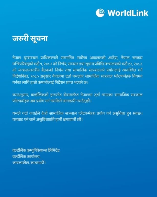 वर्ल्डलिंक कम्युनिकेशन्स लिमिटेडले दूरसञ्चार प्राधिकरणले अदालतको आदेश, सरकारको निर्णय, सञ्चार तथा सूचना प्रविधि मन्त्रालयको निर्देशिकाअनुसार नेपालमा दर्ता नभएका सामाजिक सञ्जाल अब वर्ल्डलिंकमा नचल्ने स्पष्ट पारेको छ ।