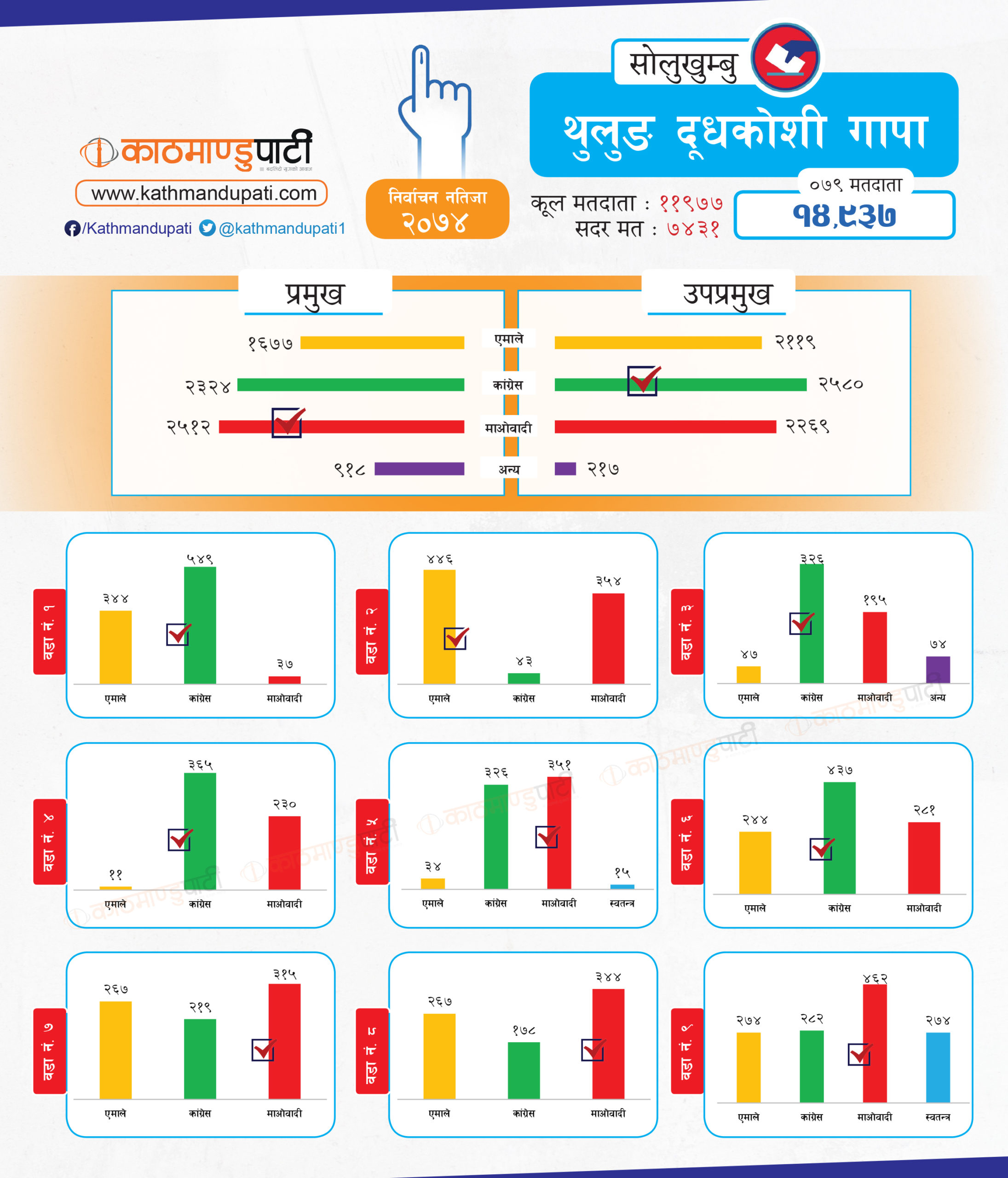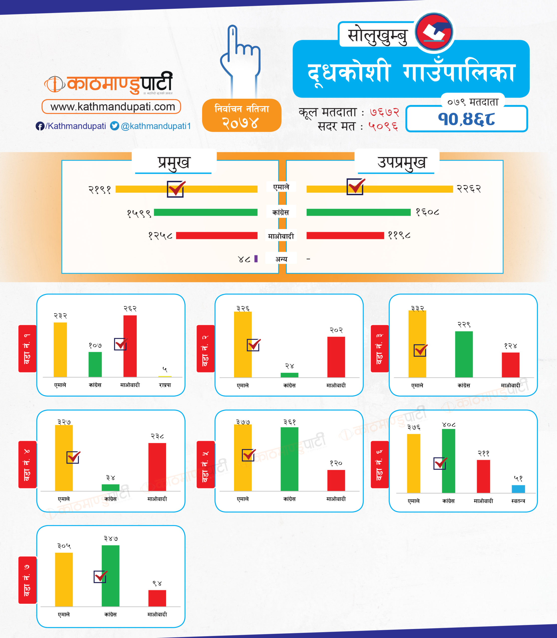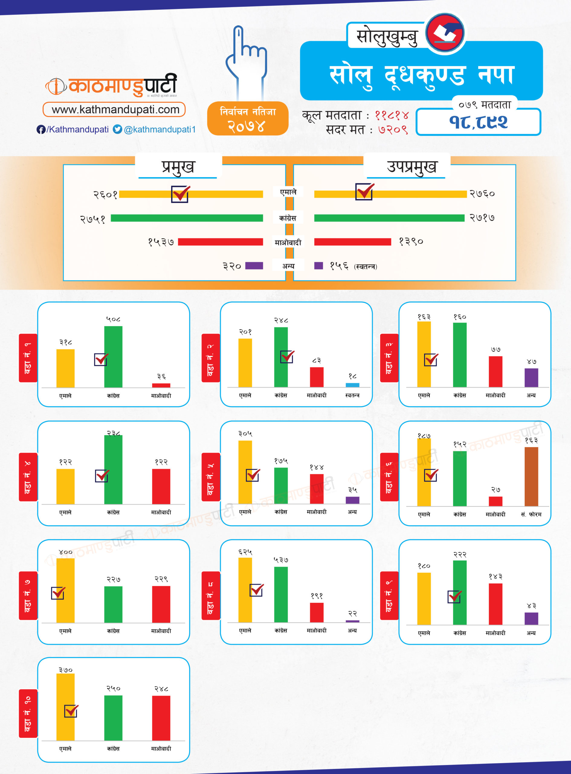 एमालेले खुम्बु–पासाङल्हामु, दूधकोसी र सोताङ गाउँपालिकामा अध्यक्ष–उपाध्यक्ष पद जित्यो । एमाले त्यसबाहेक नेचासल्यान गाउँपालिकामा अध्यक्ष र सोलु–दूधकुण्ड नगरपालिकामा उपमेयर पदमा समेत जित निकाल्न सफल भयो । माओवादी केन्द्रले लिखुपिके गाउँपालिकाको अध्यक्ष–उपाध्यक्ष तथा महाकुलुङ र थुलुङ–दूधकोसी गाउँपालिकाको अध्यक्षमा जित निकाल्यो ।