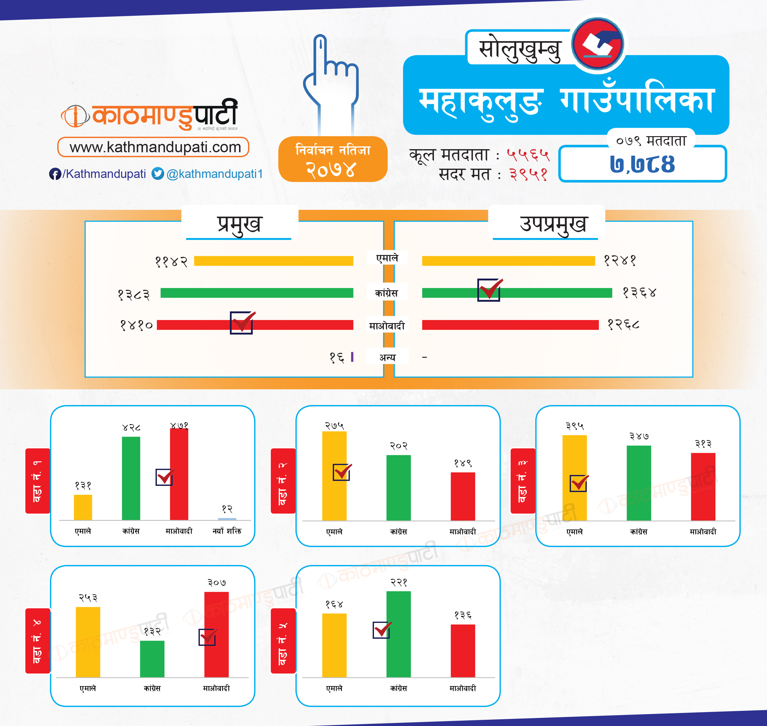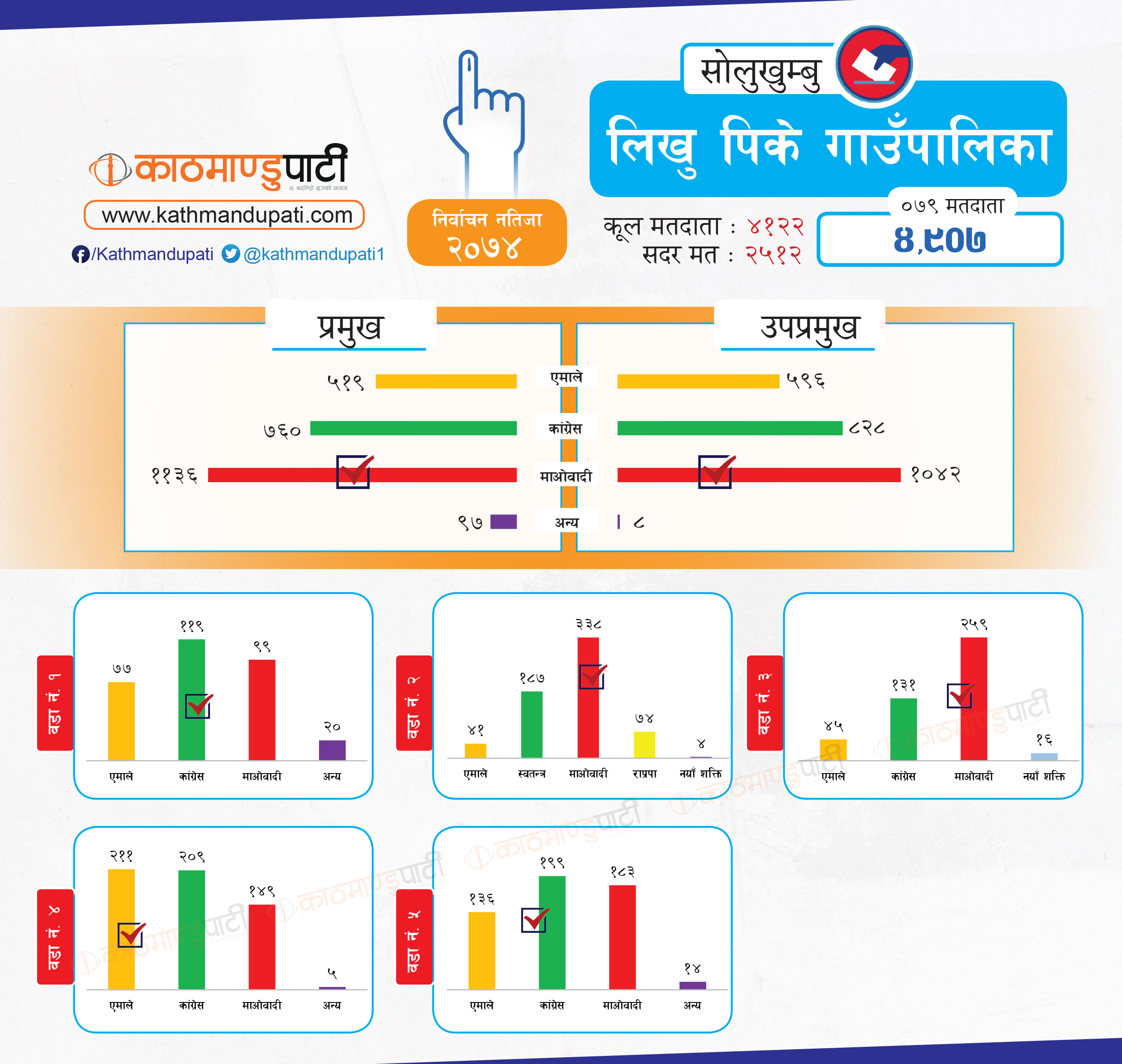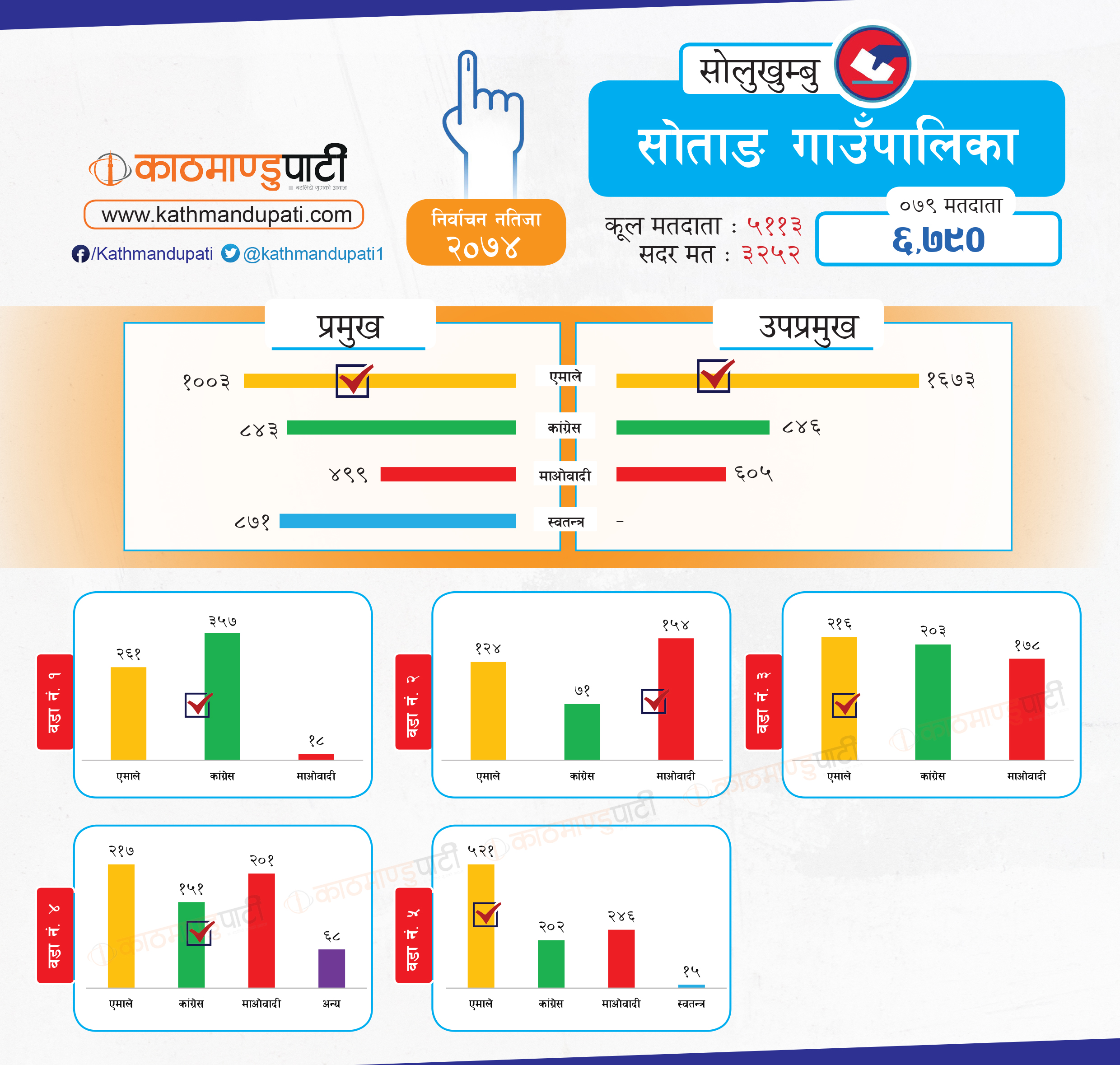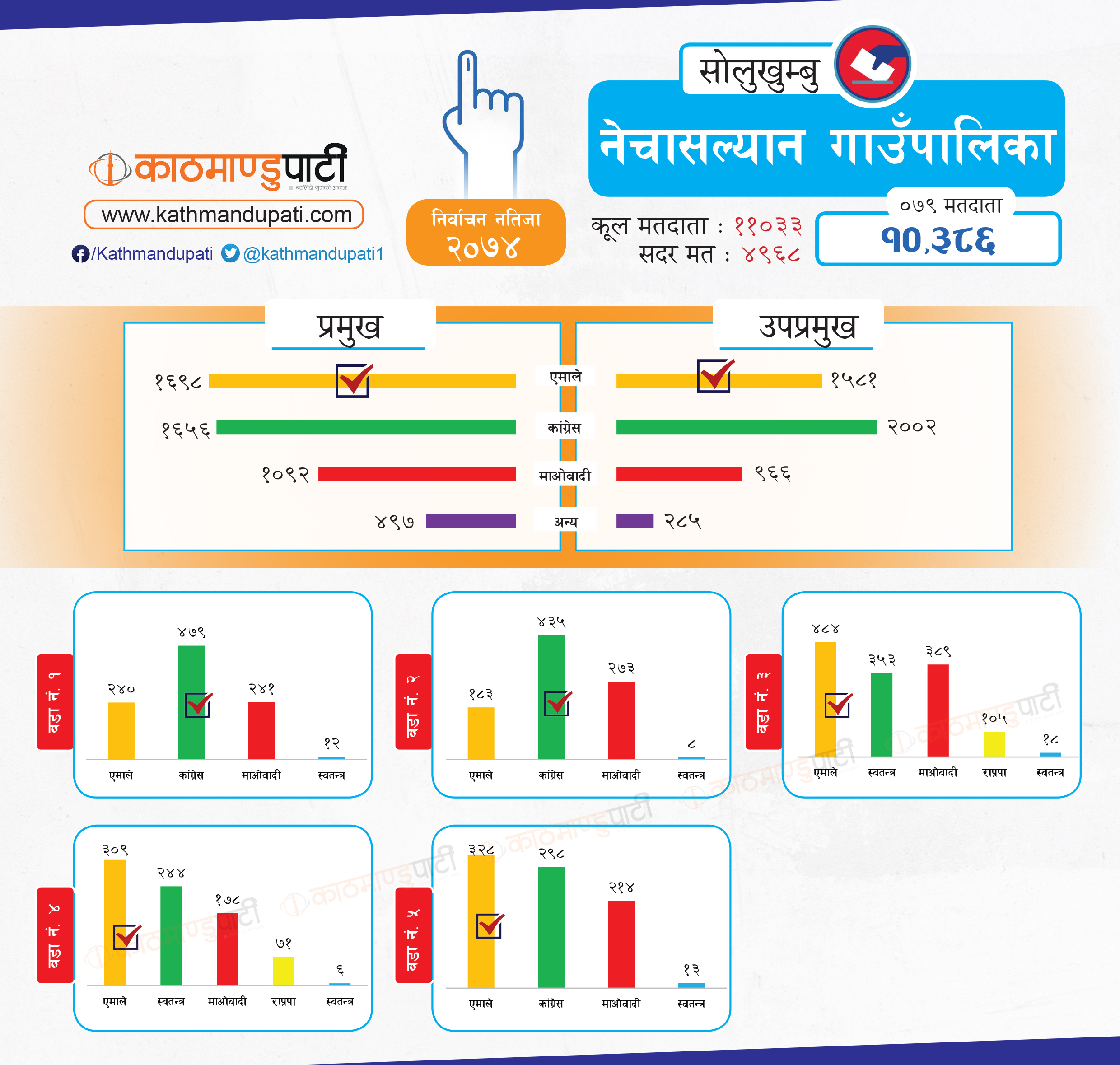 एमालेले खुम्बु–पासाङल्हामु, दूधकोसी र सोताङ गाउँपालिकामा अध्यक्ष–उपाध्यक्ष पद जित्यो । एमाले त्यसबाहेक नेचासल्यान गाउँपालिकामा अध्यक्ष र सोलु–दूधकुण्ड नगरपालिकामा उपमेयर पदमा समेत जित निकाल्न सफल भयो । माओवादी केन्द्रले लिखुपिके गाउँपालिकाको अध्यक्ष–उपाध्यक्ष तथा महाकुलुङ र थुलुङ–दूधकोसी गाउँपालिकाको अध्यक्षमा जित निकाल्यो ।