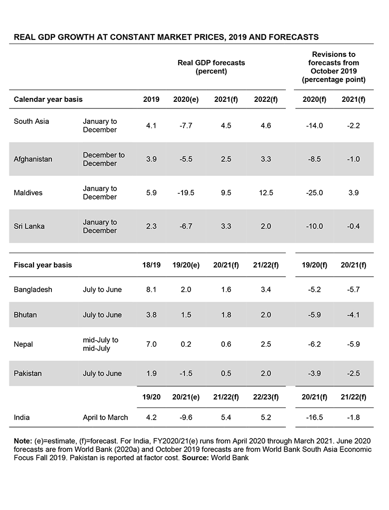 विगत पाँच वर्षदेखि वार्षिक ६ प्रतिशतको आर्थिक वृद्धिदर रहेको दक्षिण एसियाको अर्थतन्त्र कोरोनाभाइरसका कारण यसअघि ७.७ प्रतिशत खुम्चने अनुमान गरिएको थियो ।
