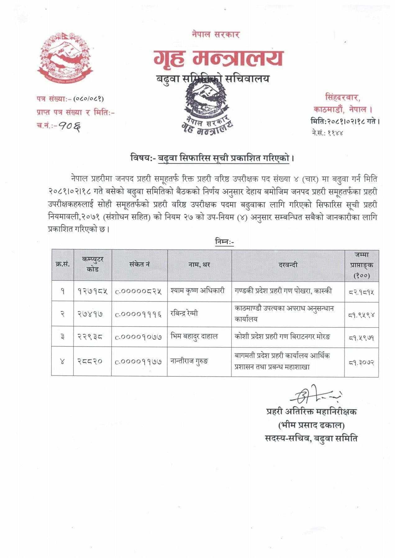 काठमाण्डु-  नेपाल प्रहरी प्रधान कार्यालयले ४ जना प्रहरी उपरीक्षक (एसपी) लाई प्रहरी बरिष्ठ उपरीक्षक (एसएसपी)मा बढुवाका लागि सिफारिस गरेको छ।