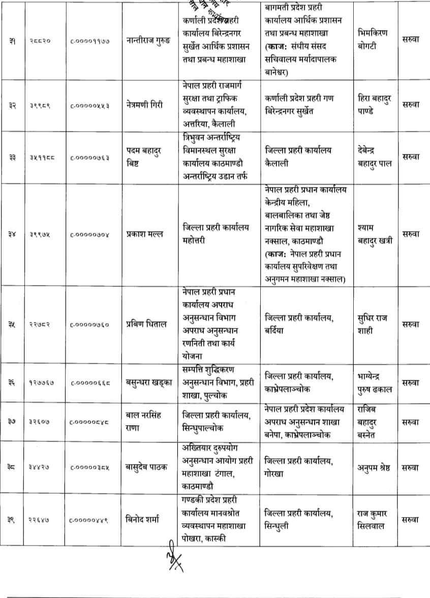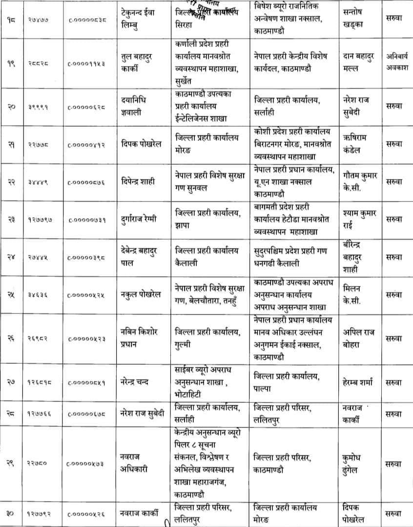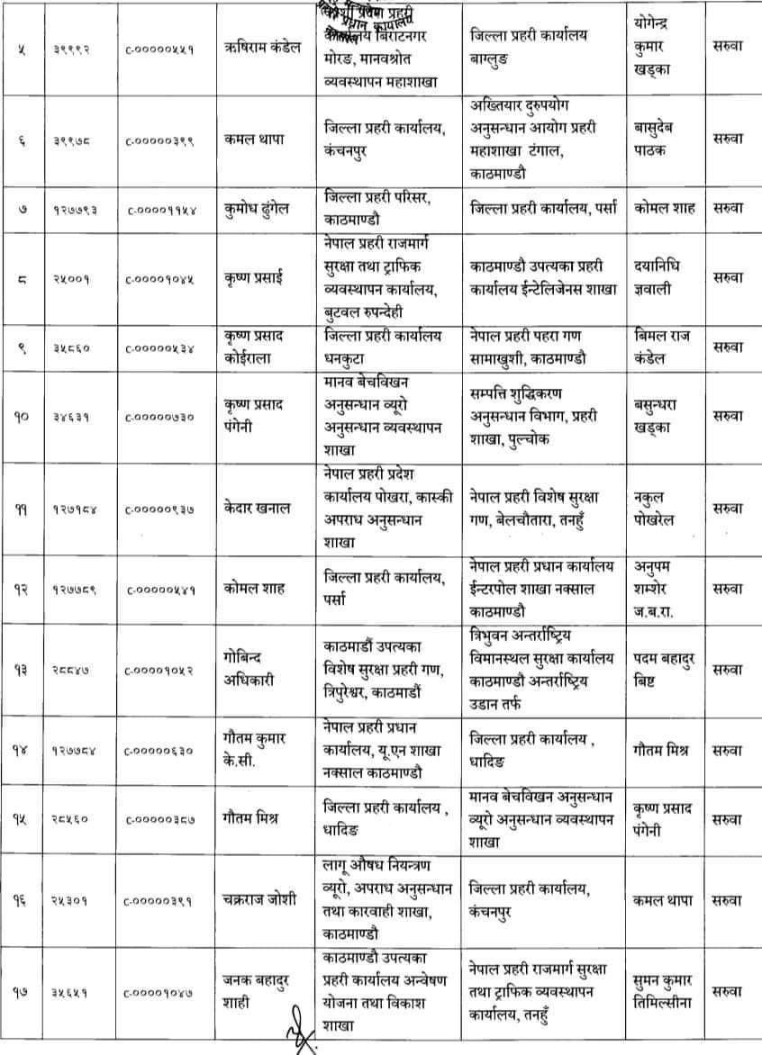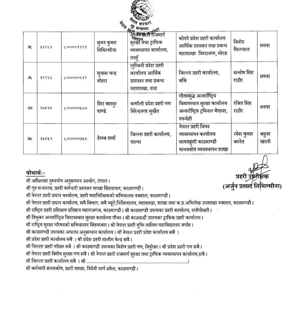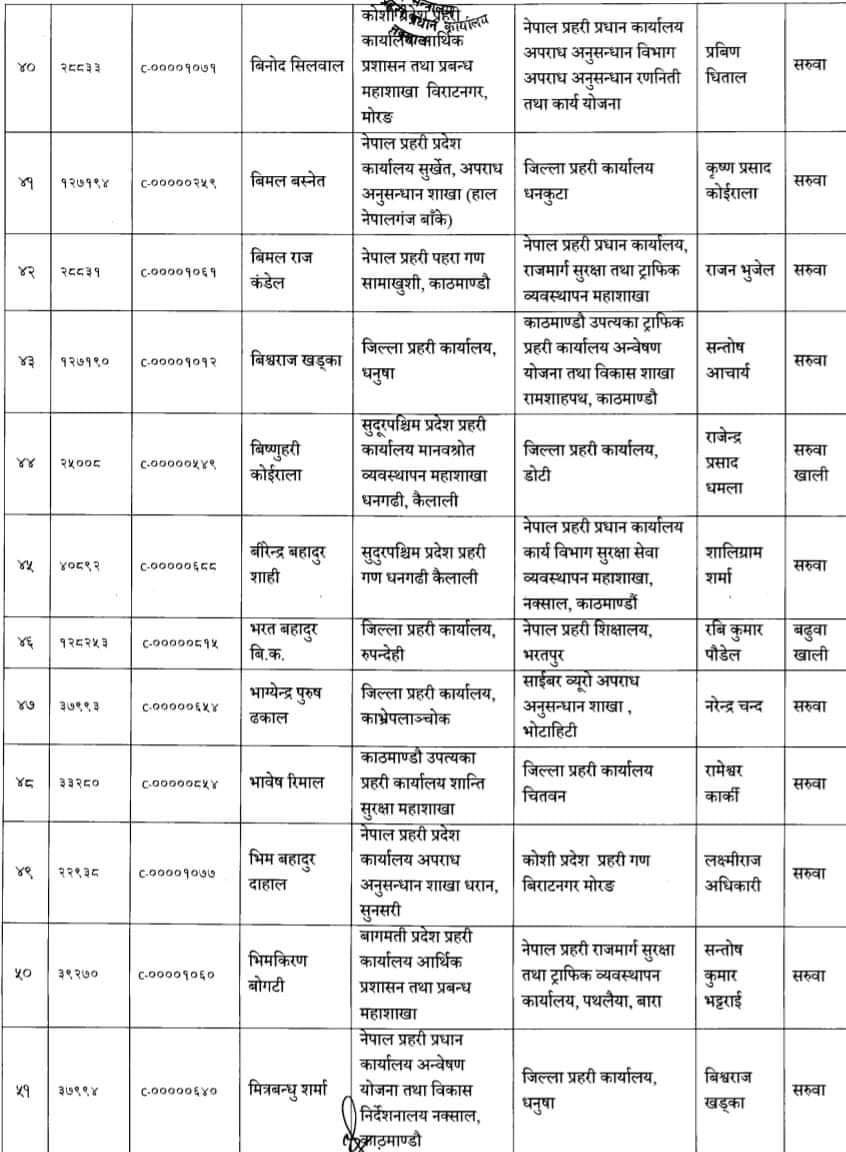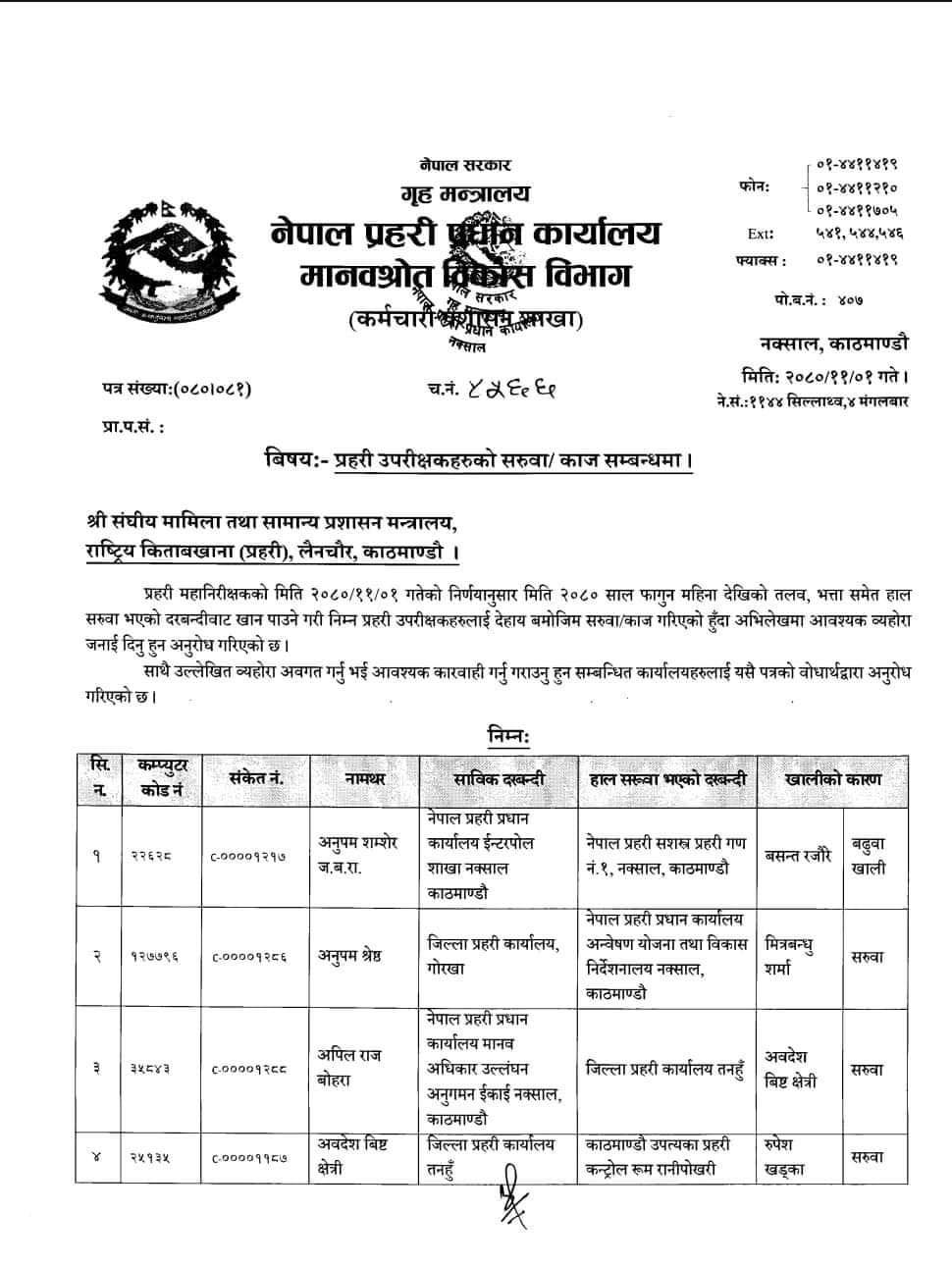 ७८ जना प्रहरी उपरीक्षकहरूको सरुवा गरिएको प्रहरी प्रधान कार्यालयले जनाएको छ । फागुन १ गते देखिको तलव, भत्ता समेत हाल सरुवा भएको दरबन्दीबाट पाउने गरी सरुवा गरिएको बताइएको छ ।