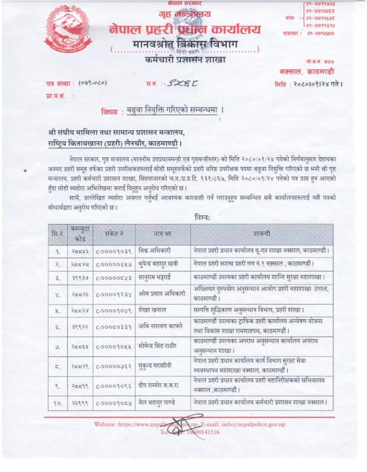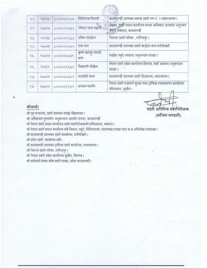 एसपीबाट एसएसपीमा बढुवा हुनेमा विश्व अधिकारी, भुपेन्द्रबहादुर खत्री, सानुराम भट्टराई, ओमप्रसाद अधिकारी, शेखर खनाल, अभिनारायण काफ्ले, सोमेन्द्रसिंह राठोर, मुकुन्द मरासिनी, दीपशमशेर जबरा छन् ।
