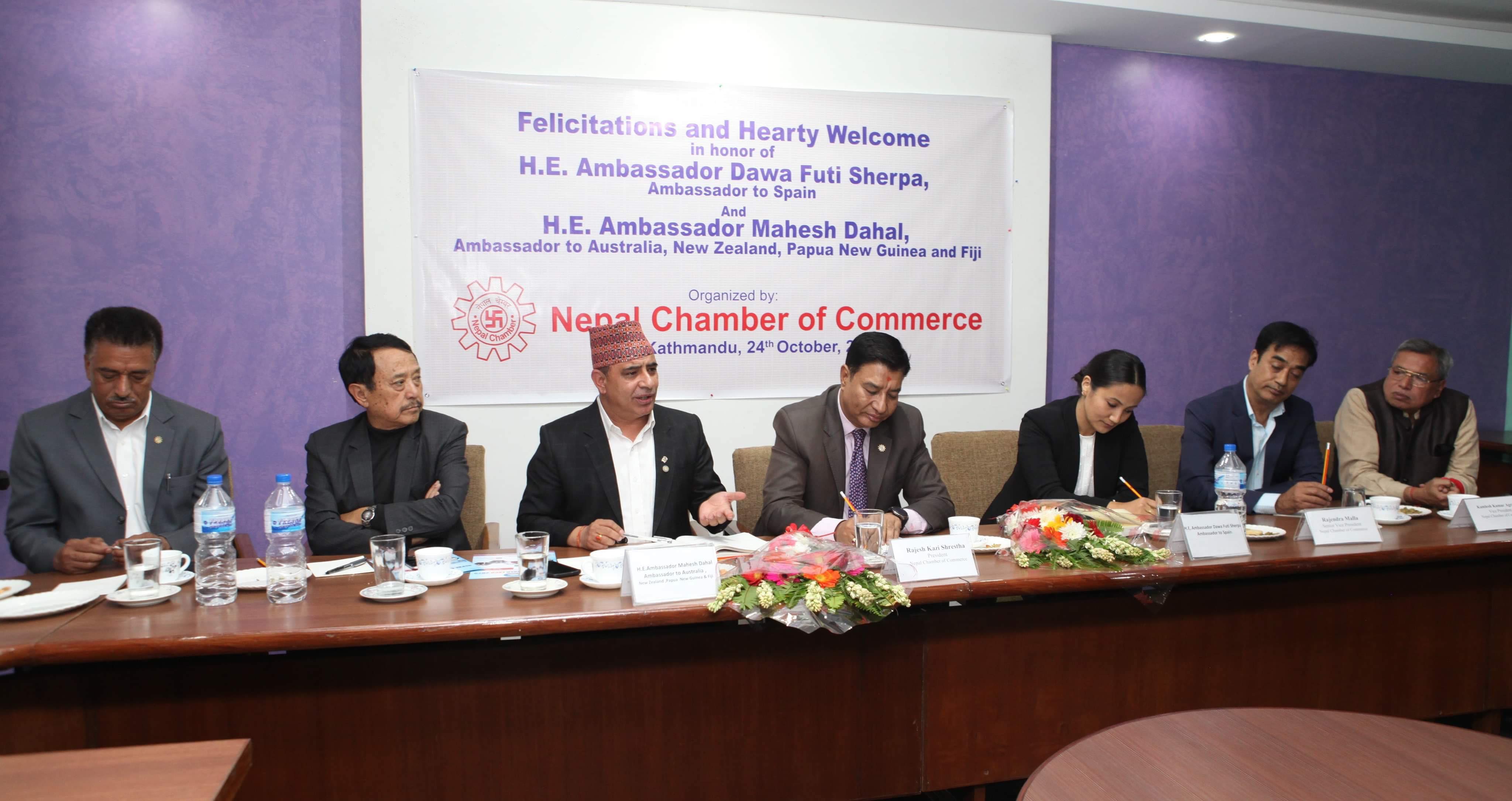 सो कार्यक्रममा चेम्बर अध्यक्ष राजेश काजी श्रेष्ठले नेपालमा जलविद्युत, पर्यटन, पेय पदार्थको उत्पादनलगायतका क्षेत्रमा स्पेनी लगानी एवं प्रविधि भित्रयाउन कुटनीतिक पहल हुनुपर्नेमा जोड दिए । अध्यक्षश्रेष्ठले विशेष गरी नेपाल र नेपाली उत्पादन एवं लगानीका क्षेत्रहरुको प्रबद्र्धन गर्न आर्थिक कुटनीति सक्रिय हुनुपर्ने बताए ।