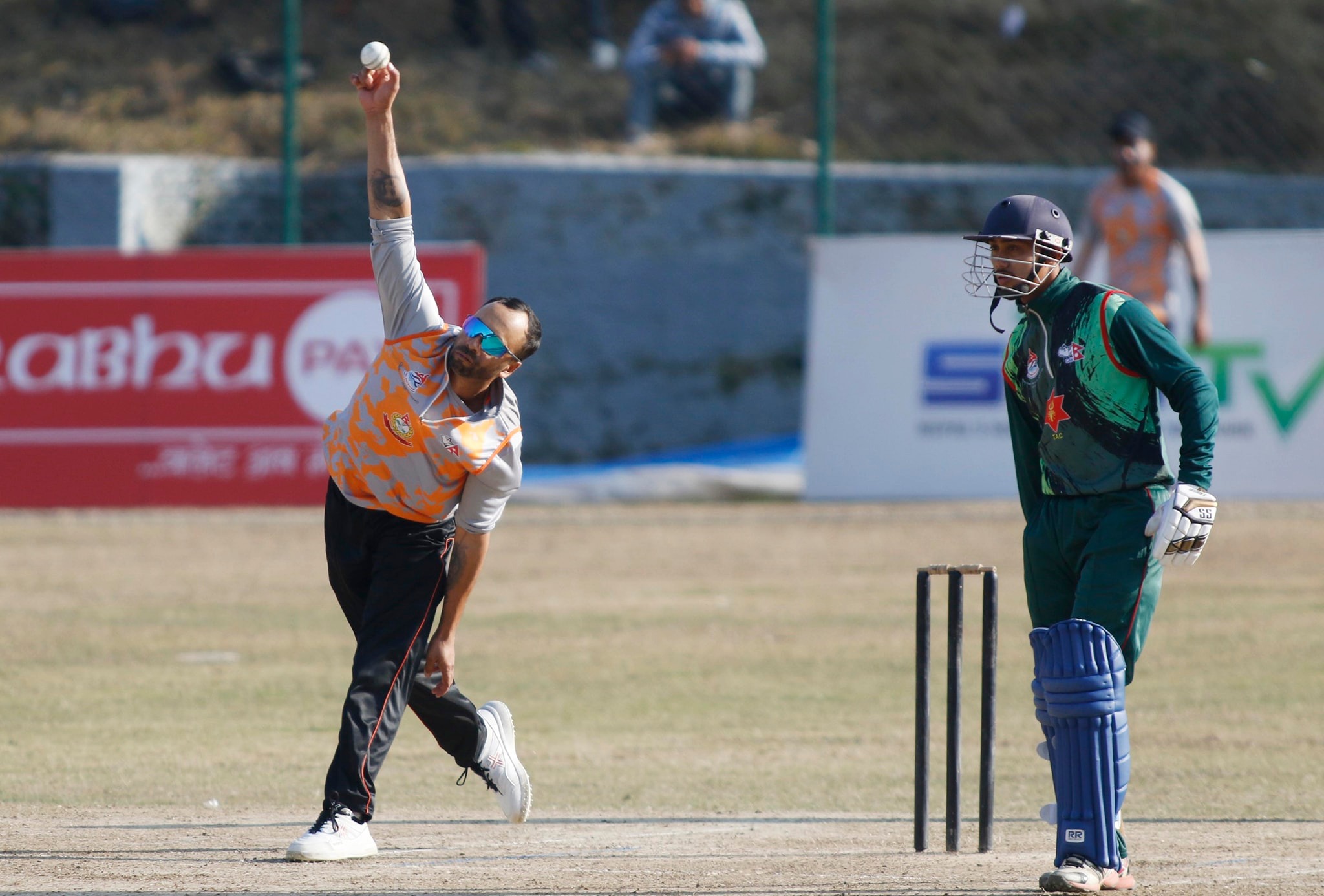 एपीएफका लागि शरद भेषवाकरले सर्वाधिक तीन विकेट हात पारे । अविनाश बोहरा र भुवन कार्कीले दुई-दुई विकेट लिँदा किशोर महतो र दिपक बोहराले एक-एक विकेट लिए । यसअघि टस हारेर पहिले ब्याटिङ गरेको एपीएफले निर्धारित २० ओभरमा दुई विकेट गुमाउँदै २३० रनको विशाल योगफल तयार पार्‍यो । एपीएफका लागि आसिफ शेखले सर्वाधिक ८४ रनको योगदान गरे । लोकेश बमले १८ बलमा ६६ रन बनाउँदा प्रदीप ऐरीले ५३ बलमा ५७ रनको योगदान गरे ।