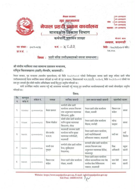 गृहमन्त्री स्तरीय शुक्रबारको निर्णयअनुसार सरुवा भएको प्रहरी प्रधान कार्यालयले जनाएको छ ।