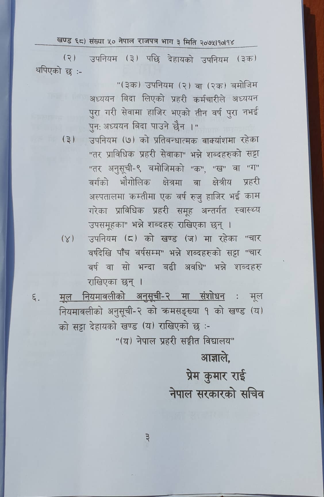प्रहरीमा अधिकृत स्तरका कर्मचारीको बढुवाकालागि कम्तीमा ४ बर्ष एउटा पदमा बसेर काम गरेको हुनुपर्ने प्रावधान यस अघिको नियमावलीमा ब्यवस्था गरिएको थियो ।