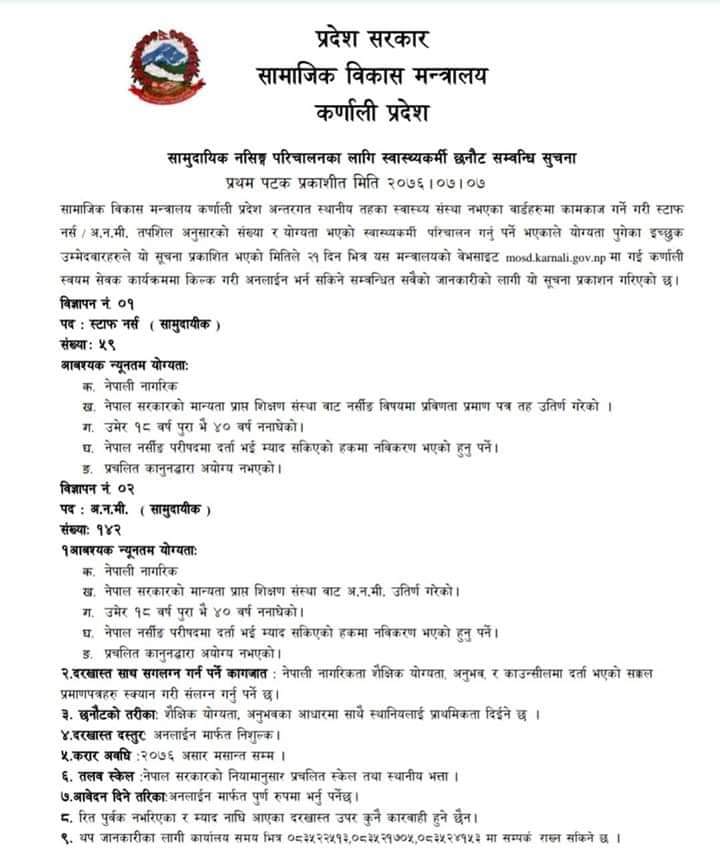 सामुदायिक नर्सिङ परिचालनका लागि प्रदेश सरकारको सामाजिक विकास मन्त्रालयद्वारा जारी गरेको सूचनामा स्थानीय तहका स्वास्थ्य संस्था नभएका वार्डहरुमा काम काज गर्ने गरी स्टाफ नर्स ५९ जना र १४२ जना अनमी पदपूर्ति गर्न लागेको जनाएको छ ।