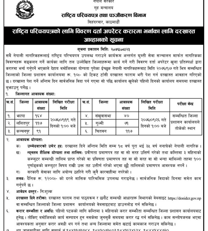काठमाडौं – गृहमन्त्रालय अन्तरगतको राष्ट्रिय परिचय पत्रतथा पञ्ञिजकरण्का विभागले ६ जिल्लाका लागि ५ सय कर्मचारी माग गरेको छ । विभागले करारमा दर्ता अपरेटर माग गरेको हो ।