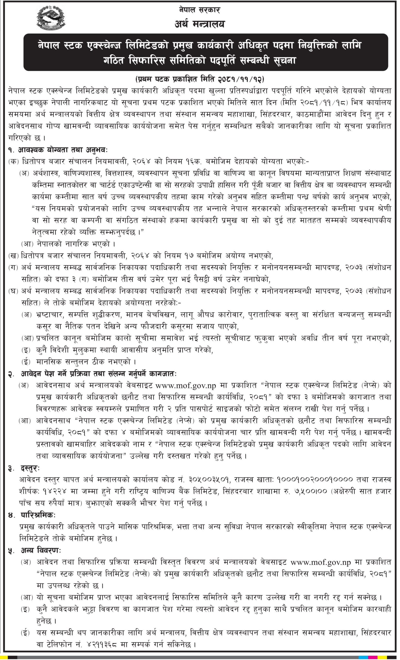 काठमाण्डु-नेपाल स्टक एक्सचेन्ज लिमिटेडको प्रमुख कार्यकारी अधिकृत (सीईओ )पदका लागि दरखास्त आह्वान भएको छ ।