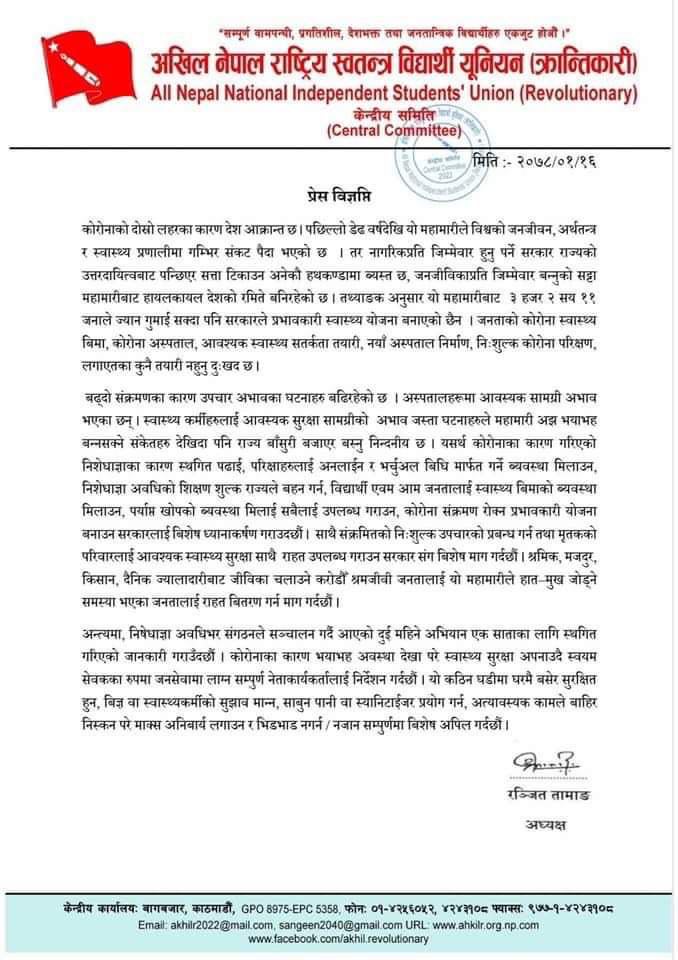 विज्ञप्तिमा तामाङ्गले भनेका छन्, ’बढ्दो संक्रमणका कारण उपचार अभावका घटनाहरु बढिरहेको छ । अस्पतालहरूमा आवस्यक सामग्री अभाव भएका छन् । स्वास्थ्य कर्मीहरुलाई आवश्यक सुरक्षा सामग्रीको अभाव जस्ता घटनाहरुले महामारी अझ भयाभह बन्नसक्ने संकेतहरु देखिदा पनि राज्य बाँसुरी बजाएर बस्नु निन्दनीय छ । यसर्थ कोरोनाका कारण गरिएको निशेधाज्ञाका कारण स्थगित पढाई, परिक्षाहरुलाई अनलाईन र भर्चुअल बिधि मार्फत गर्ने व्यवस्था मिलाउन, निशेधाज्ञा अवधिको शिक्षण शुल्क राज्यले बहन गर्न, विद्यार्थी एवम आम जनतालाई स्वास्थ्य बिमाको व्यवस्था मिलाउन, पर्याप्त खोपको ब्यवस्था मिलाई सबैलाई उपलब्ध गराउन, कोरोना संक्रमण रोक्न प्रभावकारी योजना बनाउन सरकारलाई बिशेष ध्यानाकर्षण गराउदछौं । साथै संक्रमितको निःशुल्क उपचारको प्रबन्ध गर्न तथा मृतकको परिवारलाई आवश्यक स्वास्थ्य सुरक्षा साथै राहत उपलब्ध गराउन सरकार संग बिशेष माग गर्दछौं । श्रमिक, मजदुर, किसान, दैनिक ज्यालादारीबाट जीविका चलाउने करोडौँ श्रमजीवी जनतालाई यो महामारीले हात मुख जोड्ने समस्या भएका जनतालाई राहत बितरण गर्न माग गर्दछौं ।’
