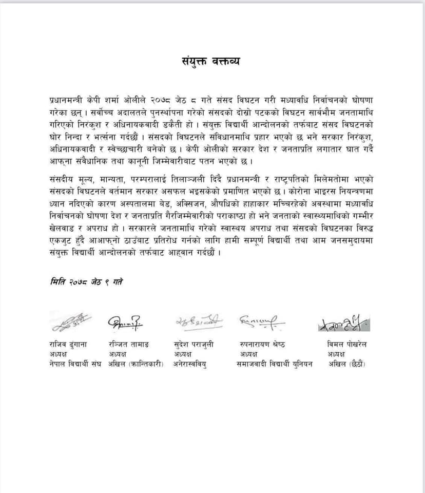 आइतबार विपक्षी गठबन्धनका पाँच वटा विद्यार्थी संगठनहरुले प्रतिनिधि विघटनको विरोधमा संयुक्त विज्ञप्ति जारी गरेका हुन् ।