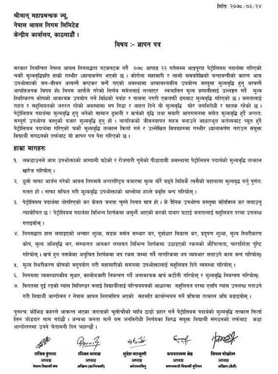 बिहीबार नेपाल आयल निगममा संयुक्त ज्ञापन पत्र बुझाउँदै उनीहरुले निषेधाज्ञाको समयमा उपभोक्ताको आम्दानीसमेत घटेको बेलामा गरिएको मूल्यवृद्धि खारेज गर्नुपर्ने माग गरेका हुन् ।