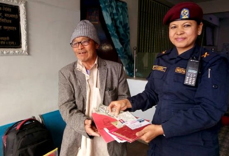 काठमाडौं – महानगरीय प्रहरी प्रभागकी प्रमुख, प्रहरी निरीक्षक सुभद्रा वाइवाको सक्रियतामा हराएका नगद र कागजपत्र सम्बन्धित धनीलाई बुझाइएको छ । गत फागुन १९ गते उदयपुरको गाइघाटबाट कोटेश्वर आउने क्रममा टाटा सुमोबाट हराएको नगद, लालपुर्जा लगायतका महत्वपूर्ण कागजपत्र भएको झोला शुक्रबार सम्बन्धित झोलाधनीले फिर्ता पाएका हुन् ।