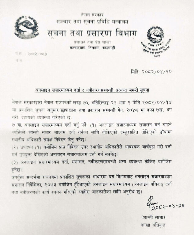विभागकी शाखा अधिकृत शान्ती लामाले मंगलबार सूचना प्रकाशित गरी विभागले अनलाइन सञ्चारमाध्यम दर्ता र नवीकरण कार्य स्थगित गरेको जानकारी दिएकी छन् ।