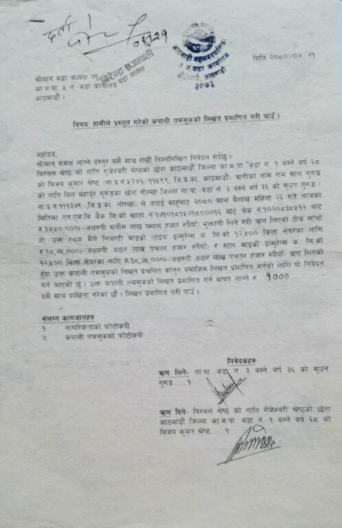 उक्त लिखत काठमाण्डु महानगरपालिका वडा नम्बर–५ को कार्यालयबाट २१ साउन ०८० को मितिमा प्रमाणीकरण भएको छ । लिखतमा वडाअध्यक्ष वीरेन्द्र प्रजापतिले वडाको छाप लगाएर प्रमाणित गरेका छन् ।