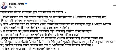 नेता किराँतीले आफ्नो फेसबुक पोस्टमार्फत यी विषयमा सहमति भए मात्र आफू यात्रामा सँगै हिँड्न सक्ने स्पष्ट पारेका छन्।