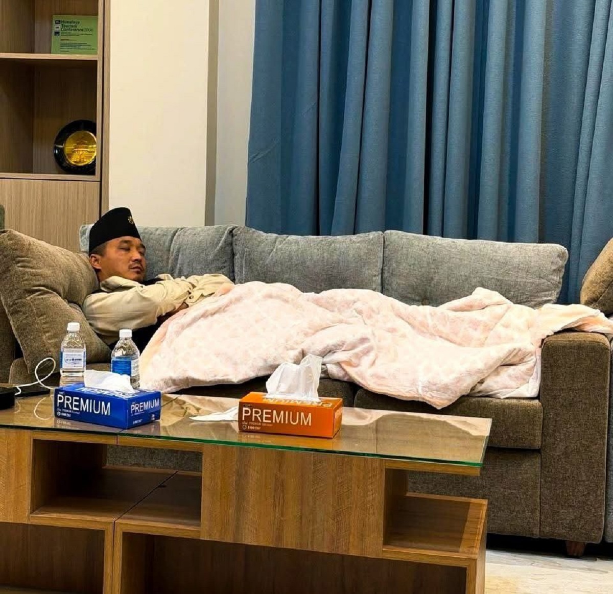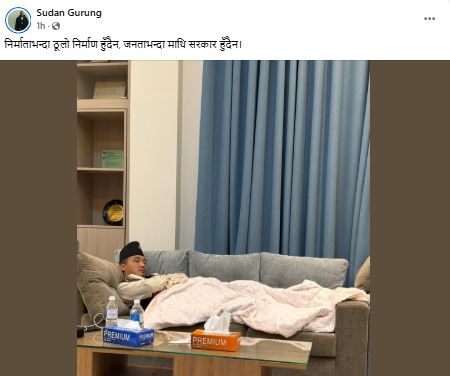 सामाजिक सञ्जाल फेसबुकमा उनले मन्त्रालयको सोफामा सिरक ओढेर सुतिरहेको तस्वीर सार्वजनिक गरेका हुन् ।