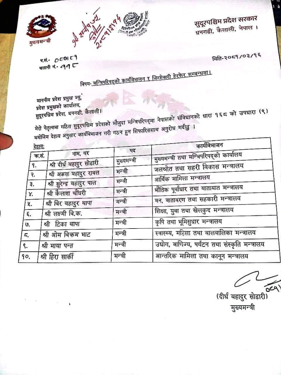 अक्कलबहादुर रावललाई जलस्रोत तथा सहरी विकास, एमालेका बिरबहादुर थापालाई वन वातावरण तथा सहकारी, हिरा सार्कीलाई आन्तरिक मामिला तथा कानुन, लक्ष्मी विकलाई शिक्षा युवा तथा खेलकुद मन्त्रालय र माया पन्तलाई उद्योग वाणिज्य पर्यटन तथा संस्कृति मन्त्रालयको जिम्मेवारी मुख्यमन्त्री सोडारीले दिएको स्रोतले बतायो ।