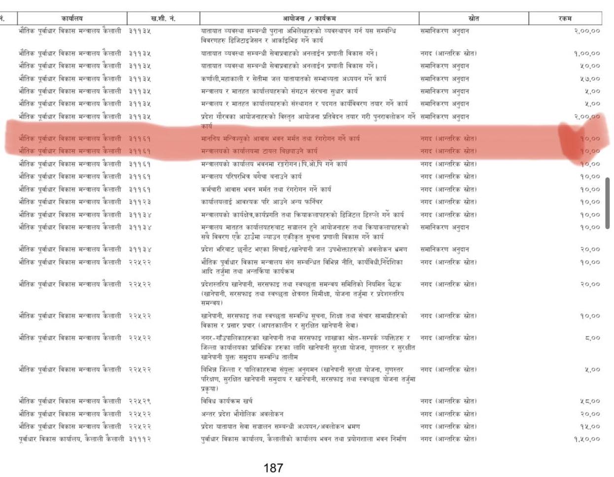 सुदुरपश्चिम प्रदेश सरकारले सार्वजनिक गरेको वार्षिक विकास कार्यक्रममा भौतिक मन्त्रीको आवास मर्मतको लागि छुटाइएको बजेट-