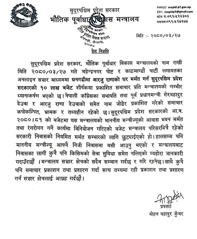 सुदूरपश्चिम प्रदेशको भौतिक पूर्वाधार विकास मन्त्रालयले सञ्चार माध्यममा प्रकाशित समाचारप्रति गम्भीर ध्यानाकर्षण भएको जनाएको छ। काठमाण्डुपाटीले बुधबार धनगढीमा आरजु राणाको घर मर्मत गर्न सुदूरपश्चिम प्रदेश सरकारको १० लाख विनियोजन शिर्षकमा समाचार प्रकाशित गरेको थियो। सो समाचारको खण्डन गर्दै मन्त्रालयका प्रवक्ता मोहन बहादुर कुँवरले समाचारमा सत्यता नरहेको जिकीर गरेका हुन्।
