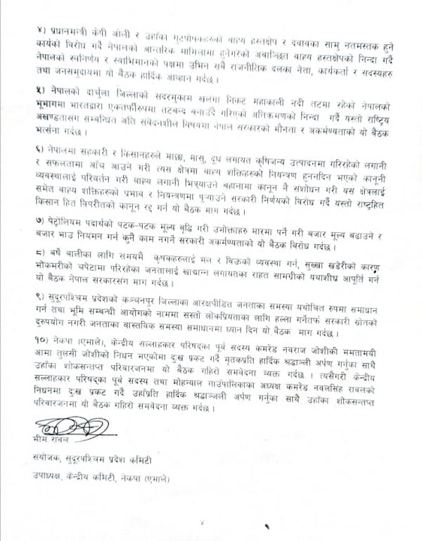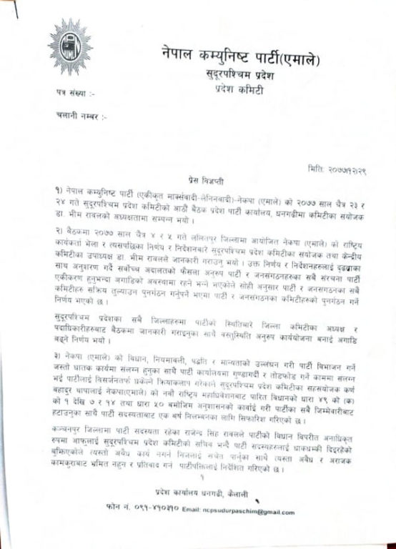 सुदूरपश्चिम प्रदेश अन्तर्गत ९ वटै जिल्लामा जनसंगठन र पेशागत संगठनका प्रदेश र जिल्ला कमिटीको पुनर्गठन गर्ने निर्णय प्रदेश गरेको छ । यसो गर्दा समावेशी सिद्धान्तलाई अवलम्बन गर्ने निर्णय गरिएको विज्ञप्तीमा भनिएको छ ।
