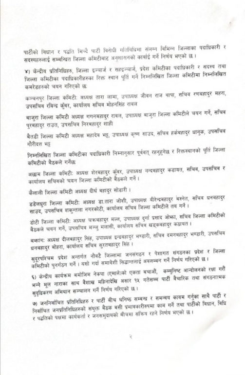 डडेलधुरा जिल्ला कमिटीः अध्यक्ष डा.तारा जोशी, उपाध्यक्ष वीरेन्द्रबहादुर बस्नेत, सचिव धनबहादुर साउद, उपसचिव शकुन्तला नगरकोटी र कार्यालय सचिव जिल्ला कमिटीले तय गर्ने बताइएको छ । डोटी जिल्ला कमिटीको अध्यक्षमा चक्रबहादुर मल्ल, उपाध्यक्ष दुर्गा प्रसाद ओझा बनेका छन् ।