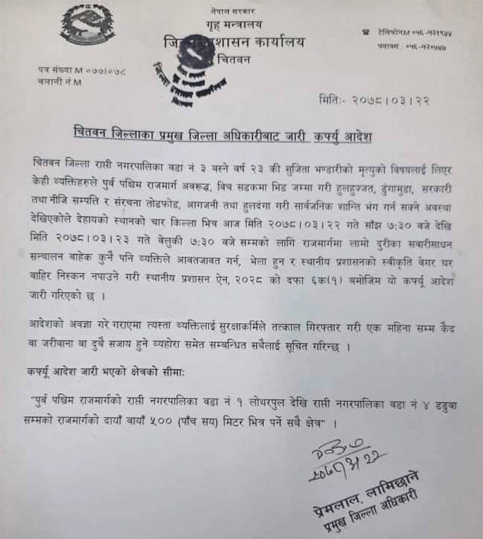 भण्डारीको मृत्युको विषयलाई लिएर सडक प्रदर्शन बढ्न थालेपछि स्थानीय प्रशासनले पूर्वी चितवनमा पुर्व पश्चिम राजमार्ग क्षेत्रमा कर्फ्यू लगाएको छ । चितवनमा प्रमुख जिल्ला अधिकारी प्रेमलाल लामिछानेले पूर्व पश्चिम राजमार्गको राप्ती नगरपालिका–१ लोथरपुलदेखि राप्ती नगरपालिका–४ डढुवासम्मको राजमार्गको दाँयाबाँया ५०० मिटर क्षेत्रमा कर्फ्यू आदेश जारी गरेका हुन् ।