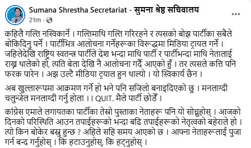 उनले लेखेकी छिन,‘कहिलै गल्ति नस्वीकार्ने । गल्तिमाथि गल्ति गरिरहने र त्यसको बोझ पार्टीका सबैले बोकिदिनु पर्ने । पार्टीभित्र आलोचना गर्नेहरूका विरूद्धमा मिडिया ट्रायल गर्ने । जहिलेदेखि राष्ट्रिय स्वतन्त्र पार्टीले देश भन्दा माथि पार्टी र पार्टीभन्दा माथि नेतालाई राख्न थालेको हो, त्यति बेला देखि नै आलोचना गर्दै आएको हुँ । तर त्यसले कत्ति पनि फरक पारेन । अझ उल्टै मीडिया ट्रयाल हुन थाल्यो । यो स्विकार्य छैन । अब खुल्लारूपमा आक्रमण गर्ने हो भने पनि सजिलो बनाइदिएको छु । मनलाग्दी चलुन्जेल मनलाग्दी गर्नु होला । मैले पार्टी छोडे।’