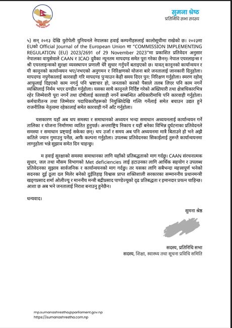 काठमाण्डु–राष्ट्रिय स्वतन्त्र पार्टी (रास्वपा) सांसद सुमना श्रेष्ठले संस्कृति, पर्यटन तथा नागरिक उड्डयन मन्त्रालयमा हवाई क्षेत्रको सुरक्षाको सुझाव पठाएकी छिन्।