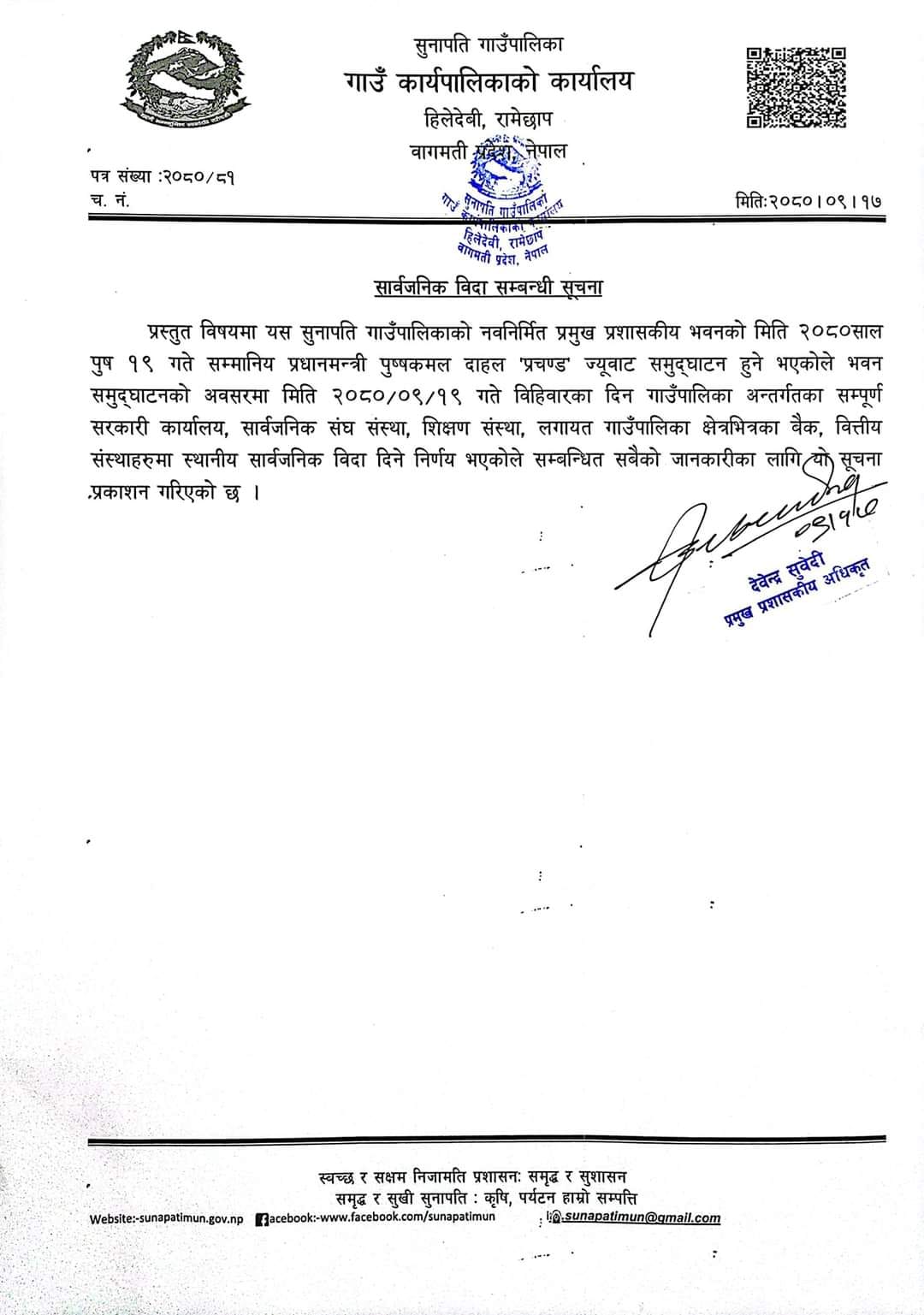 सूचनामा लेखिएको छ, ‘गाउँपालिका अन्तर्गतका सबै सरकारी कार्यालय, सार्वजनिक संघसंस्था, शिक्षण संस्था लगायत गाउँपालिका क्षेत्रभित्रका बैंक, वित्तीय संस्थाहरूमा स्थानीय सार्वजनिक बिदा दिने निर्णय भएकोले सम्बन्धित सबैको जानकारीका लागि यो सूचना प्रकाशित गरिएको छ ।’