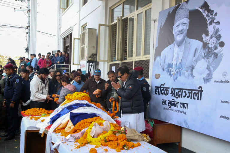 काठमाण्डु– वरिष्ठ कलाकार सुनिल थापाको पार्थिव शरीरलाई चलचित्र विकास बोर्डमा राखि अन्तिम श्रद्धाञ्जली दिइएको छ ।