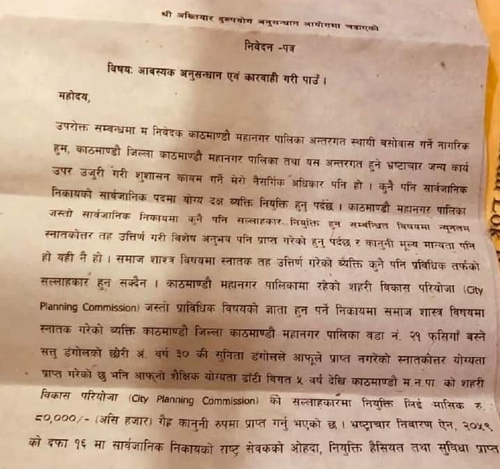 वैशाख १६ गते दर्ता भएको उजुरीमा उनको नियुक्तिको सम्पूर्ण फाइल झिकाई कानुनअनुसार सजाय दिन माग गरिएको छ ।